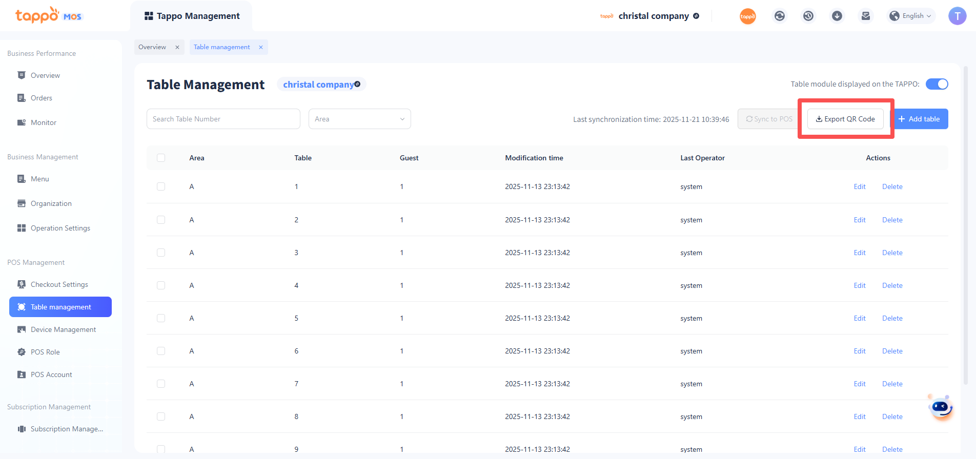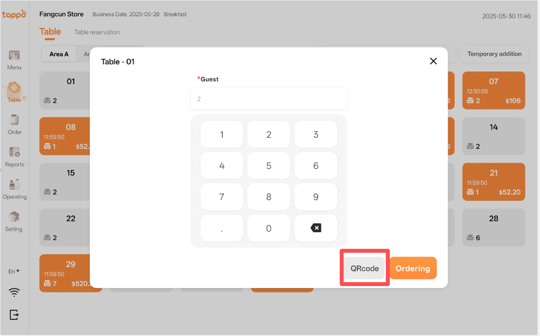 Merchants can print the one-time table QR Code for customers to scan and place orders. The operation path is: Tappo -> Table -> Click on the table -> In the pop-up window, click [QRCode] to print the one-time table QR Code.