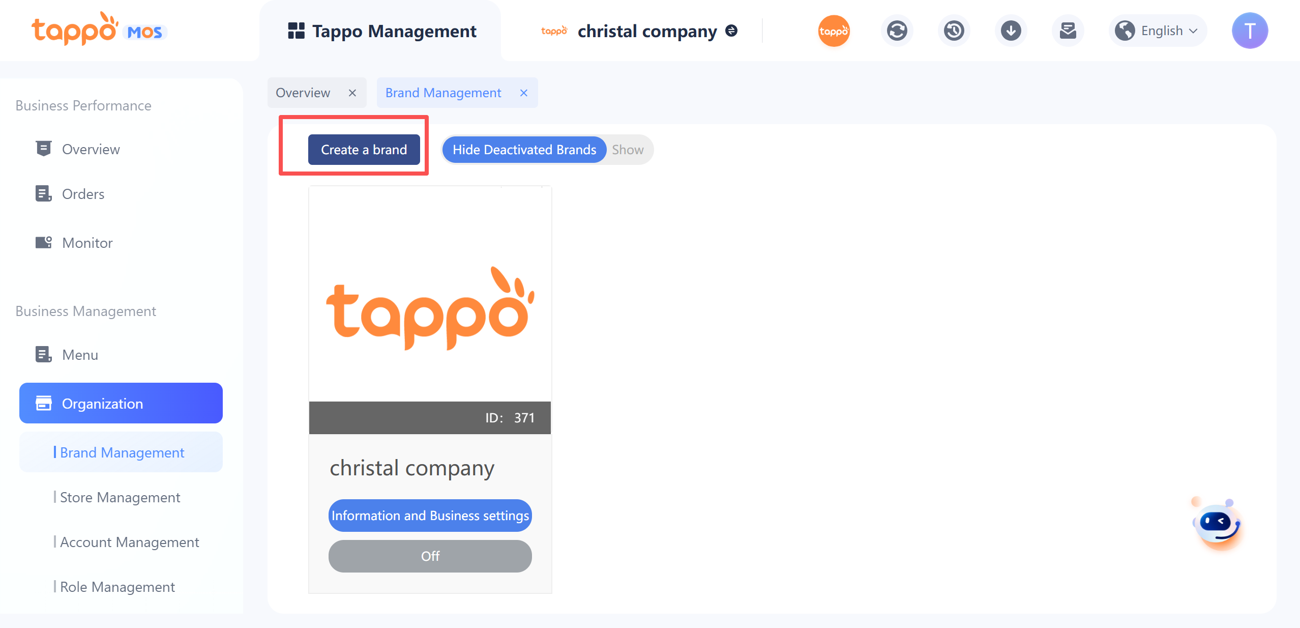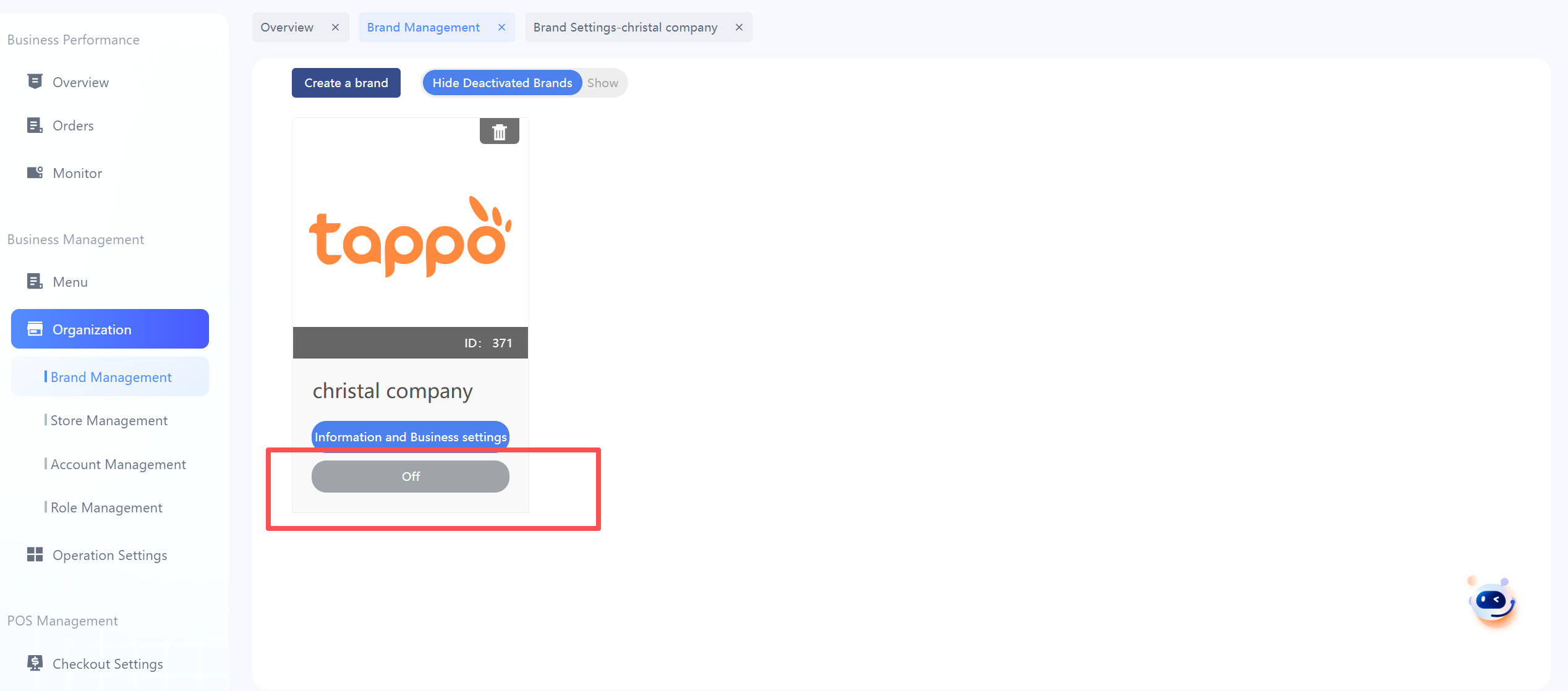 The system supports creating multiple brands, and multiple brand information is displayed in Brand Management. The brand deletion function is not supported, but brands can be deactivated and hidden.