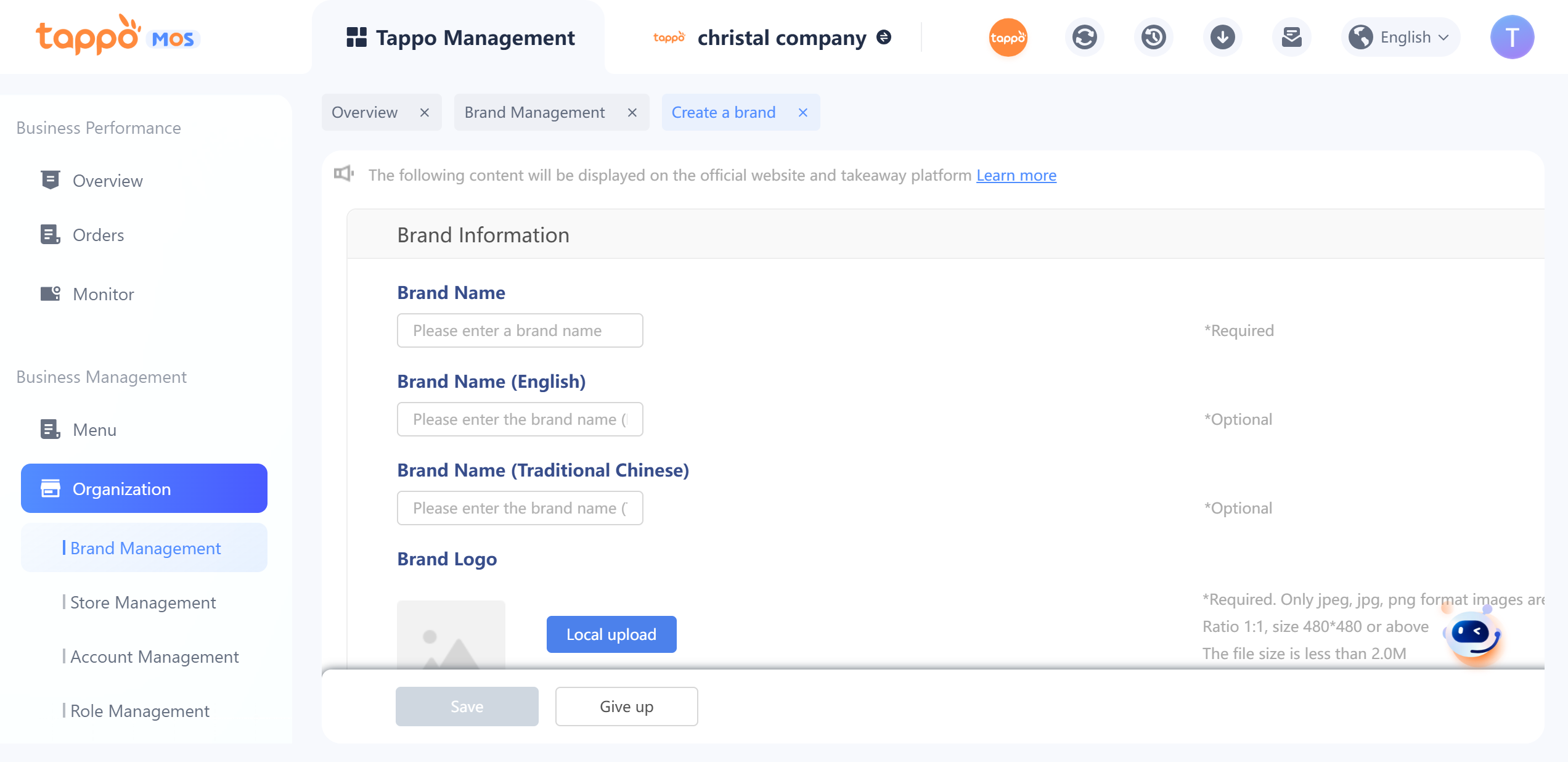 1. Brand Name: Edit the brand name to be displayed on self-operated channels. If connected to food delivery platforms, the brand information will also appear on the connected platforms. The brand name will be displayed in combination with the store name.