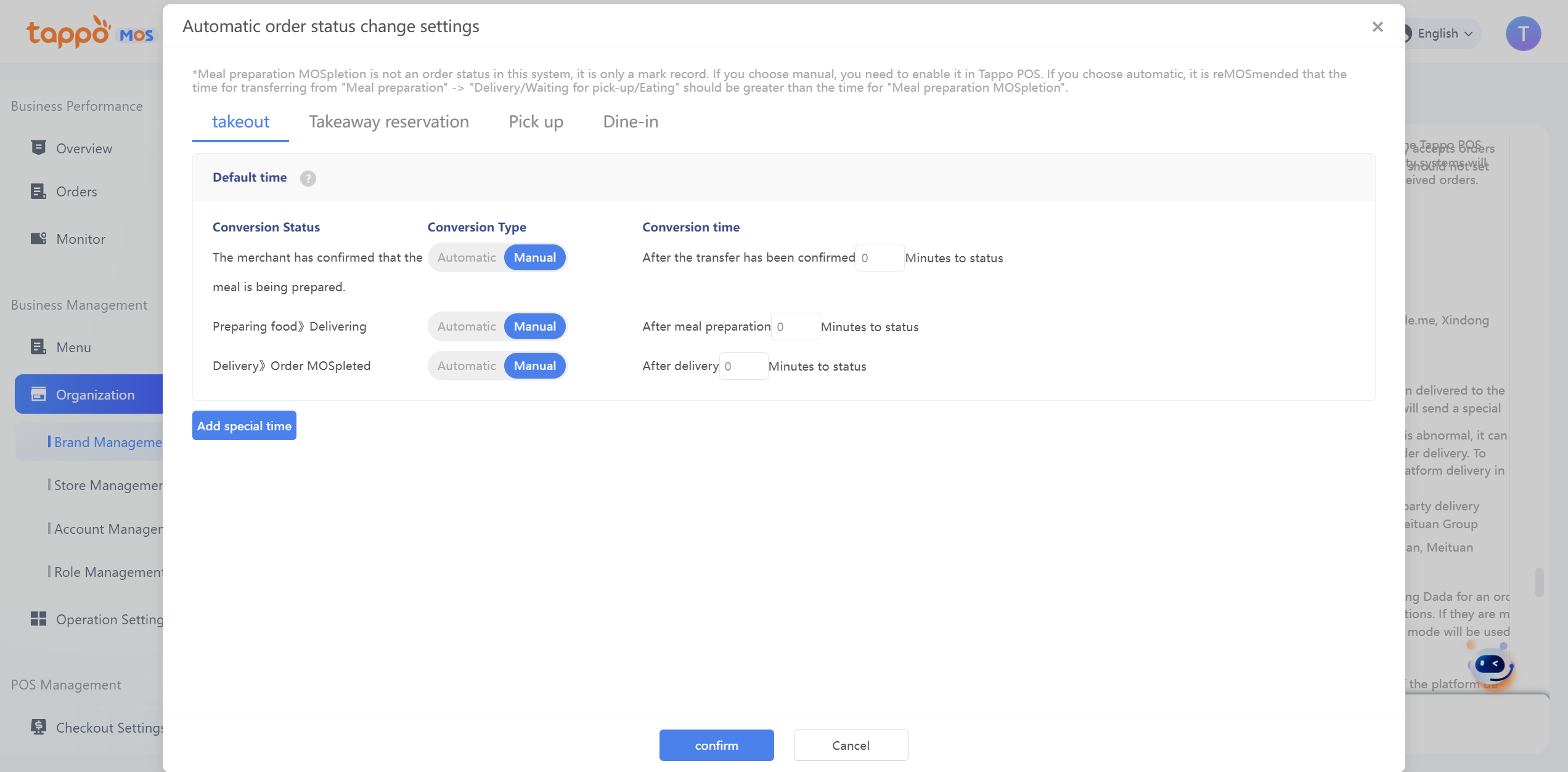 27. Offline Automatic Order Acceptance: If enabled, the system will automatically confirm orders, and only accepted orders will be received by the Tappo POS client and third-party system.