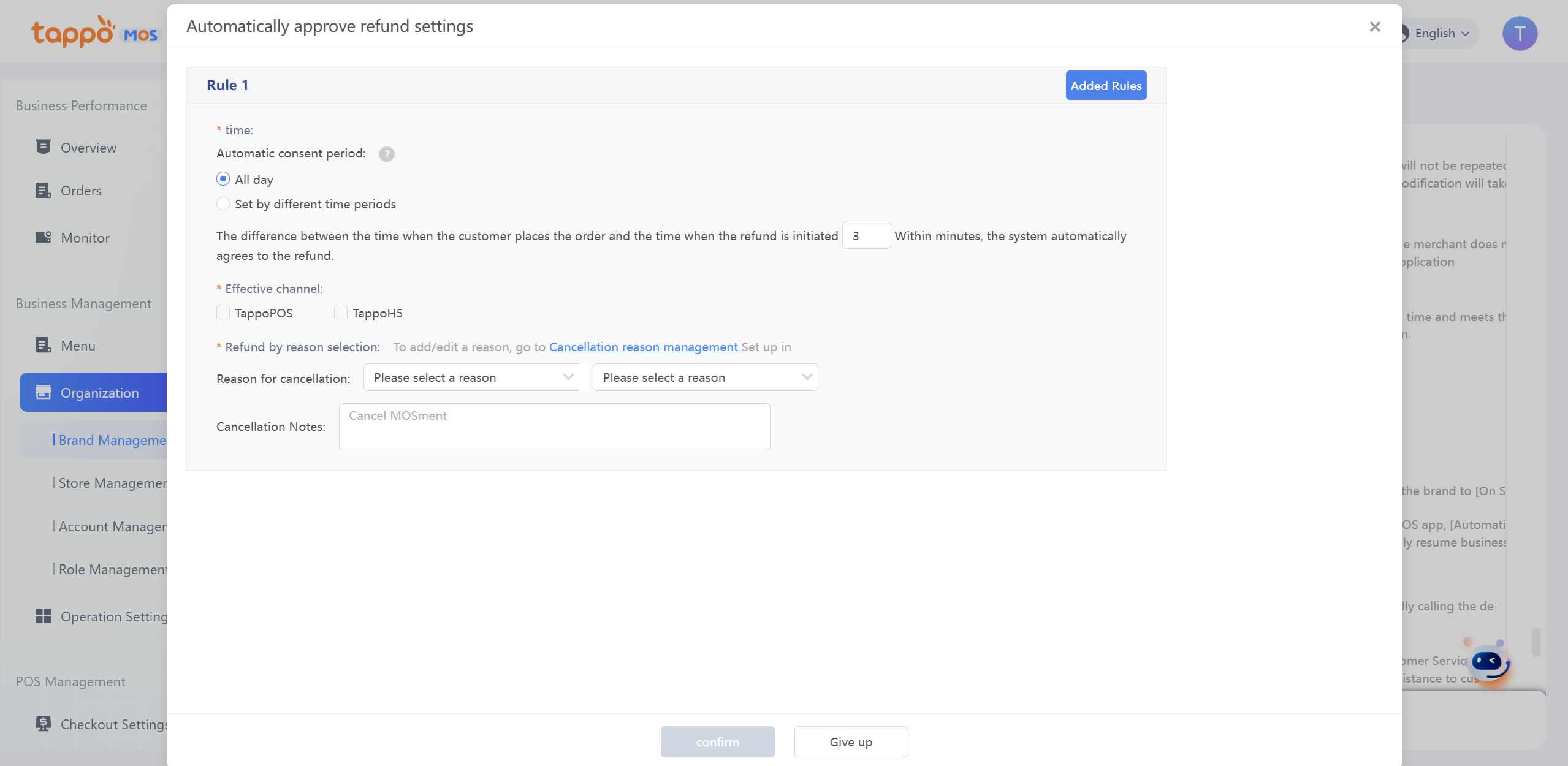 a. Effective Channels: Select the channels where the setting takes effect. For channels not selected, the system will not automatically refuse refund applications or order cancellation applications.