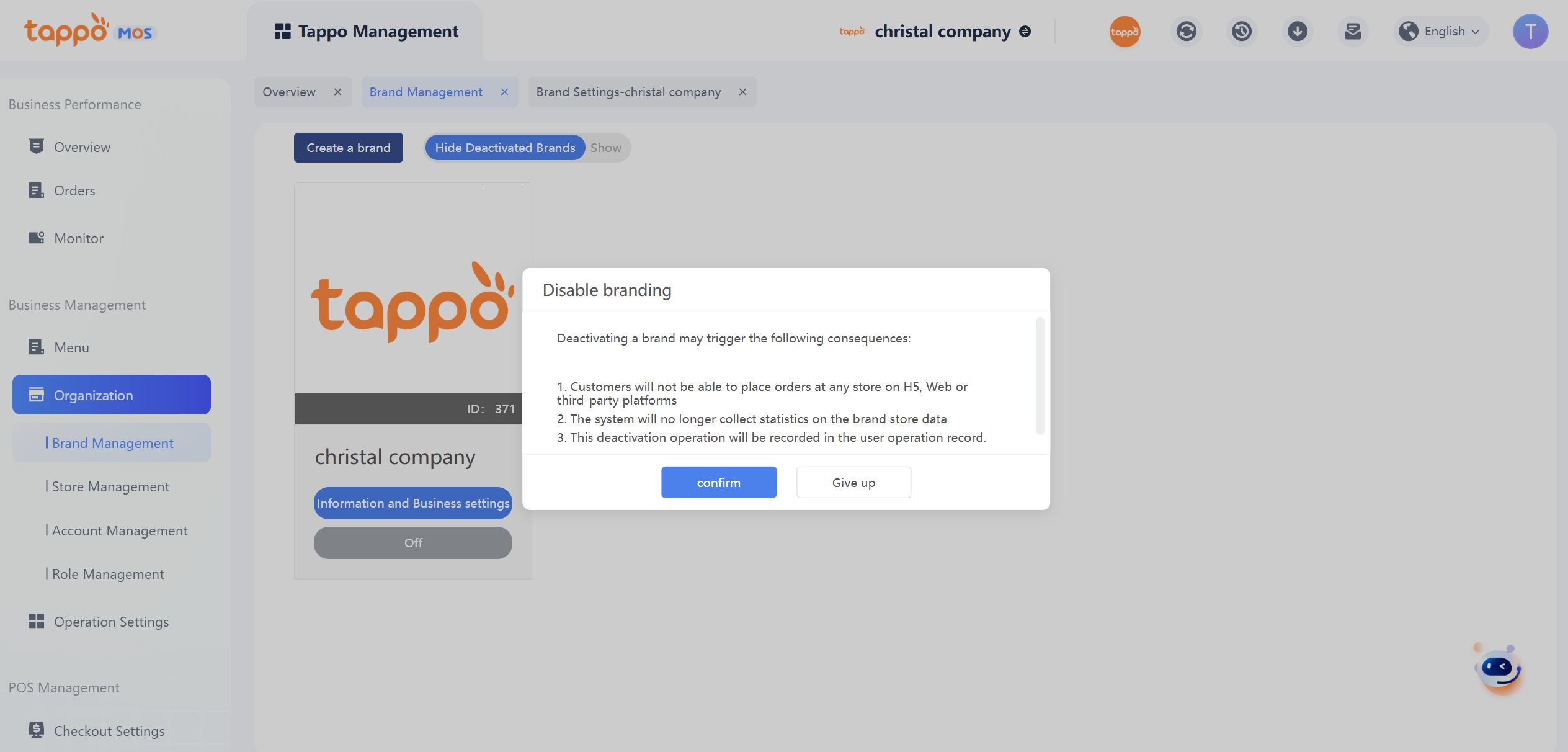 In the brand list or brand information viewing page, you can set the brand to be suspended/activated. After suspending the brand, customers will not be able to place orders through any channels, and the system will no longer count data for the brand’s stores, but data entry operations will not be affected.