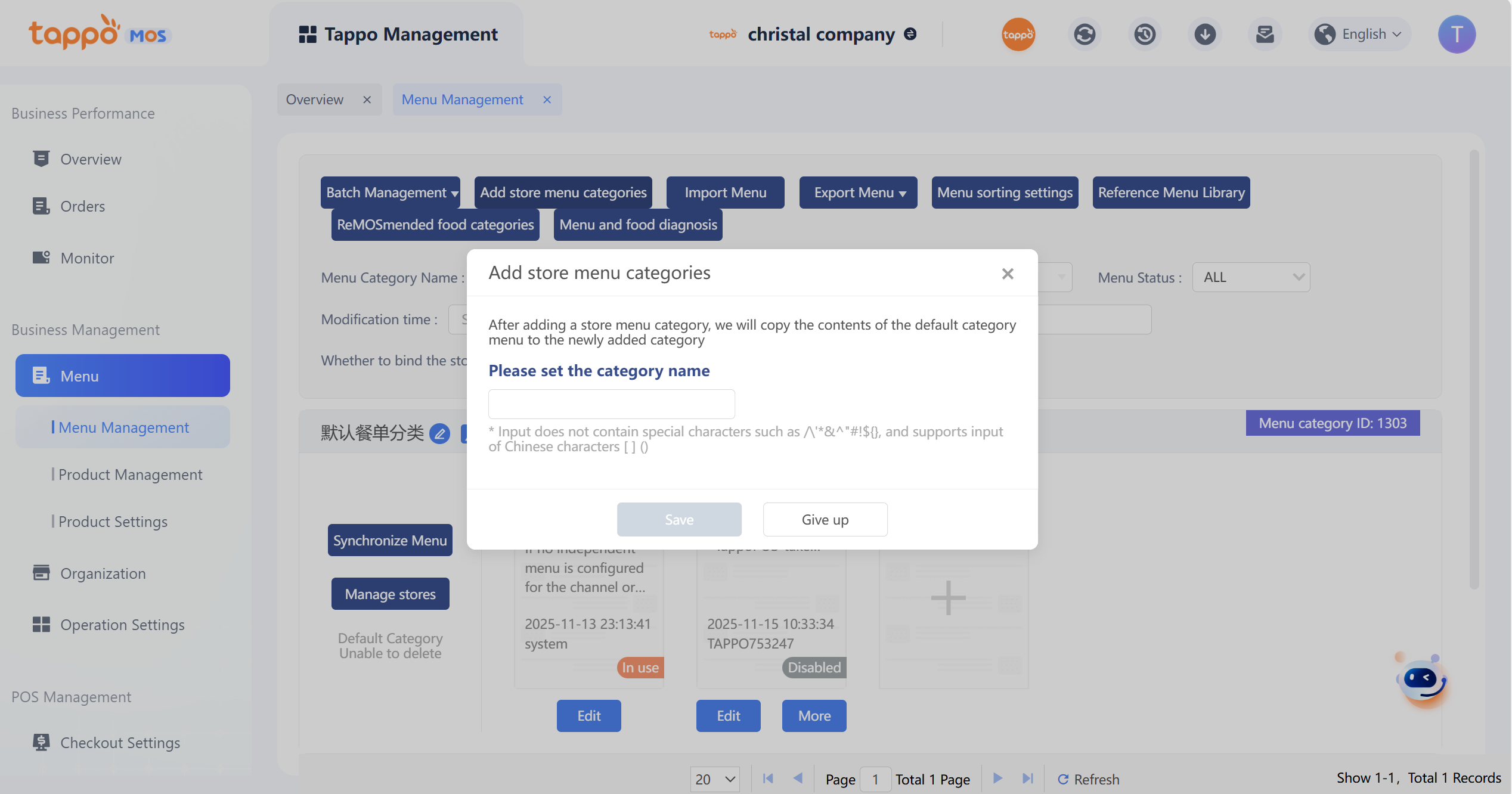 2. Enter the name and click Save. The system will copy the content of the “Default Menu” in the “Default Menu Category” to the default menu of this menu category.