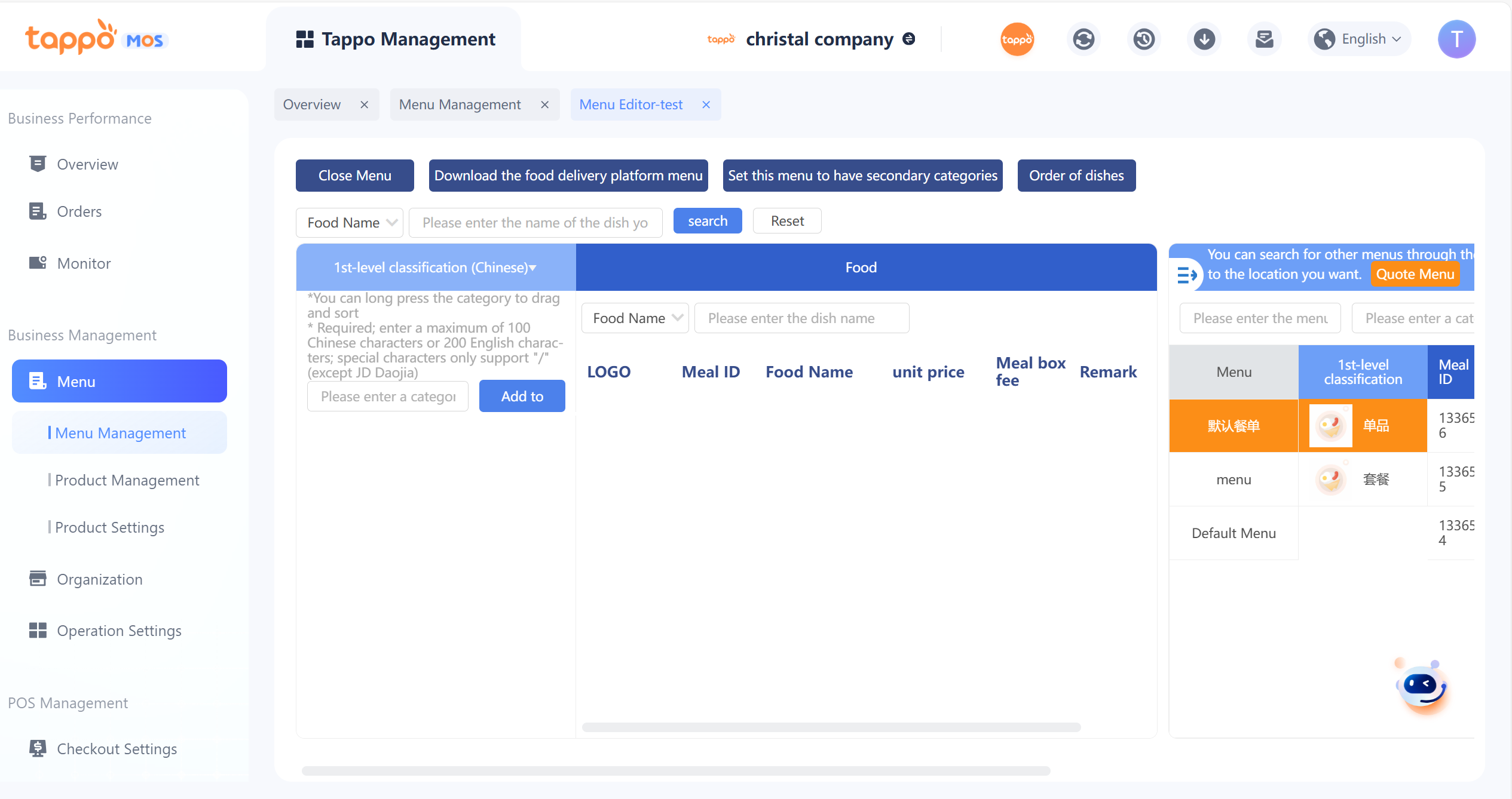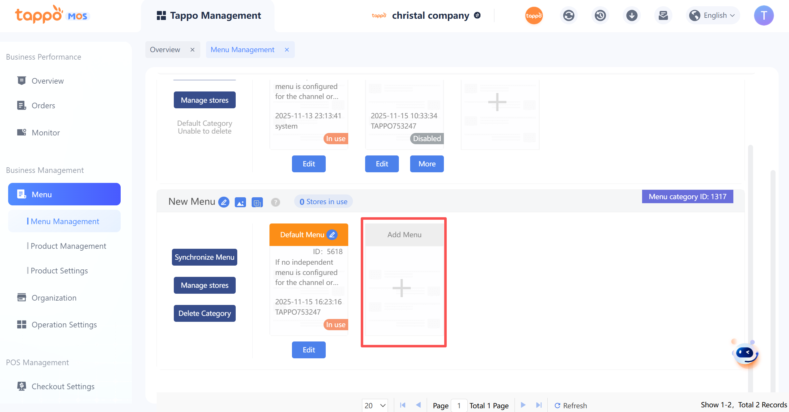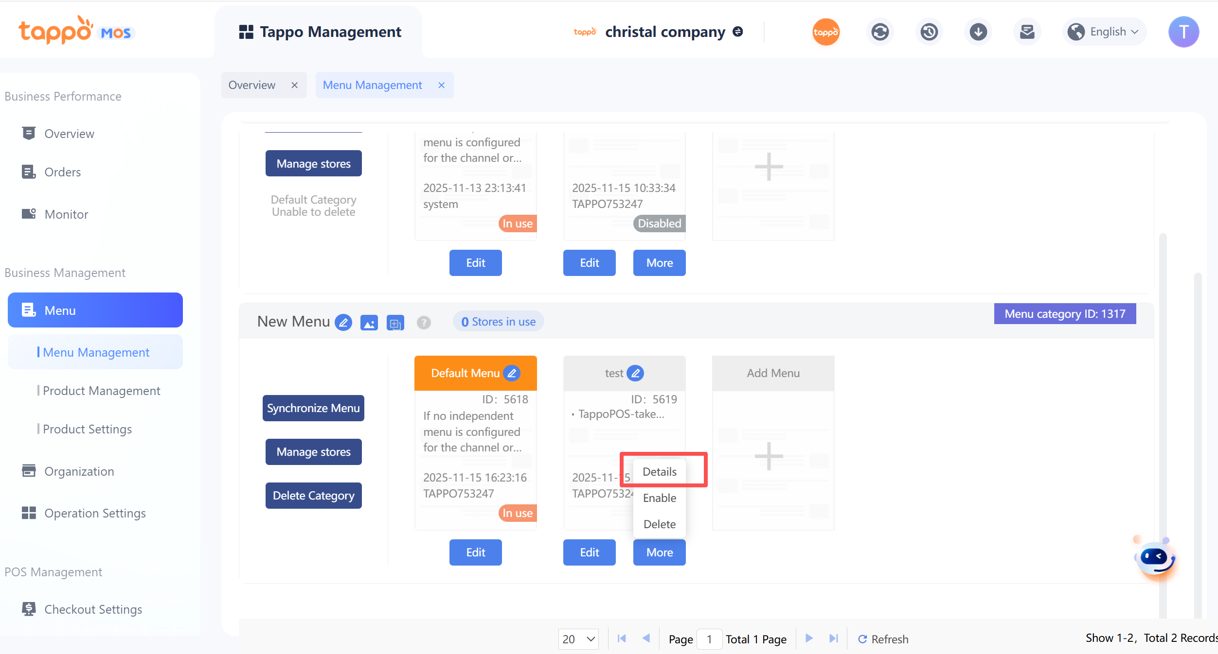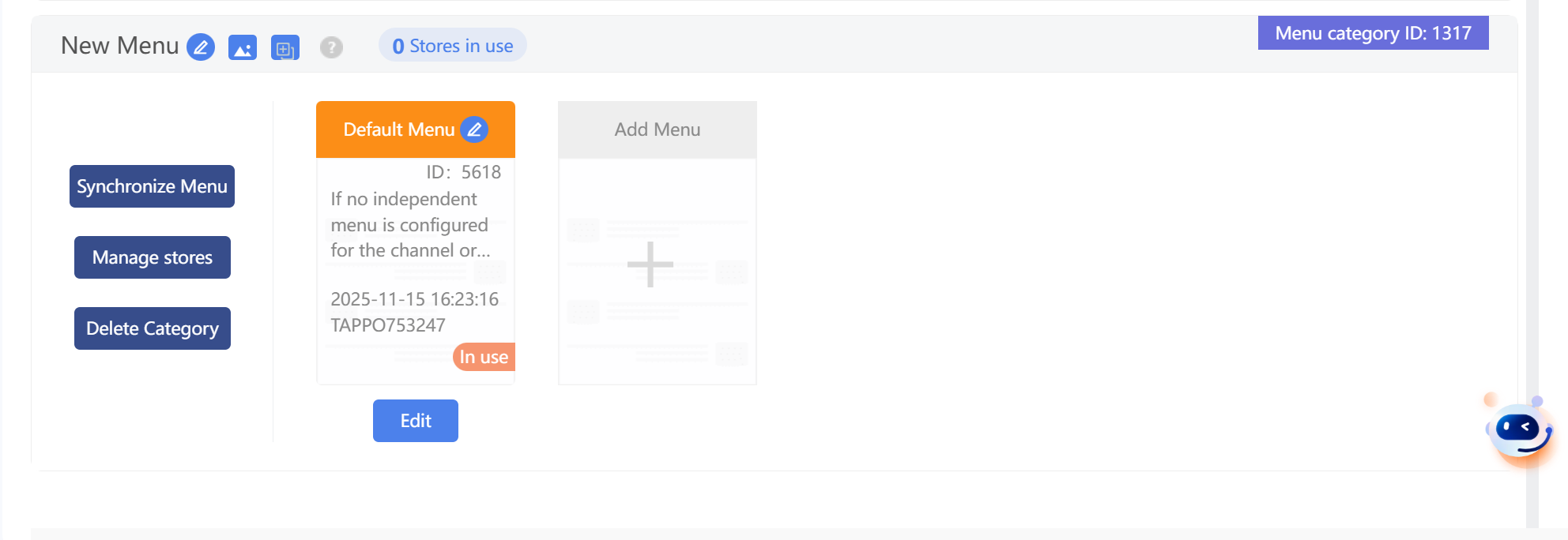 1. Default Menu Category: Each brand has a default menu category that cannot be deleted. Newly created stores are automatically bound to the default menu category.