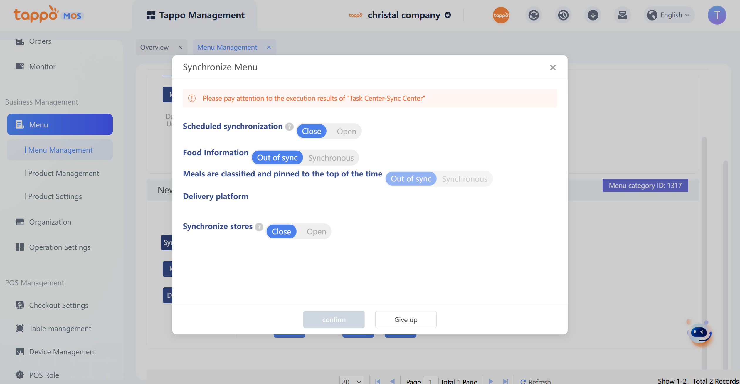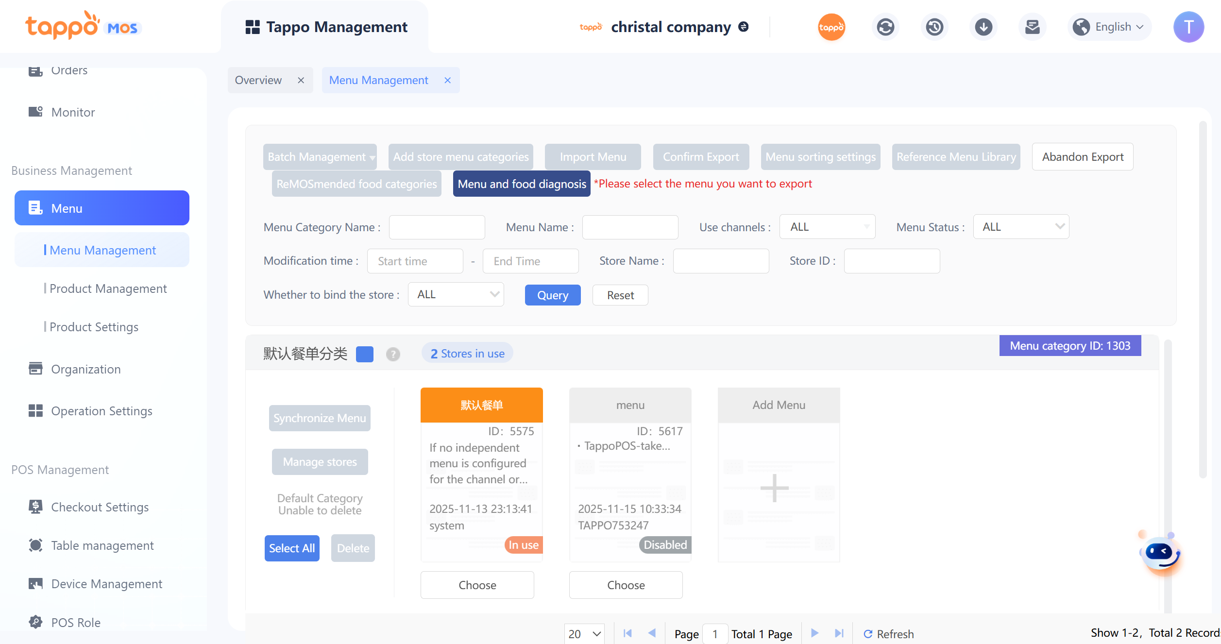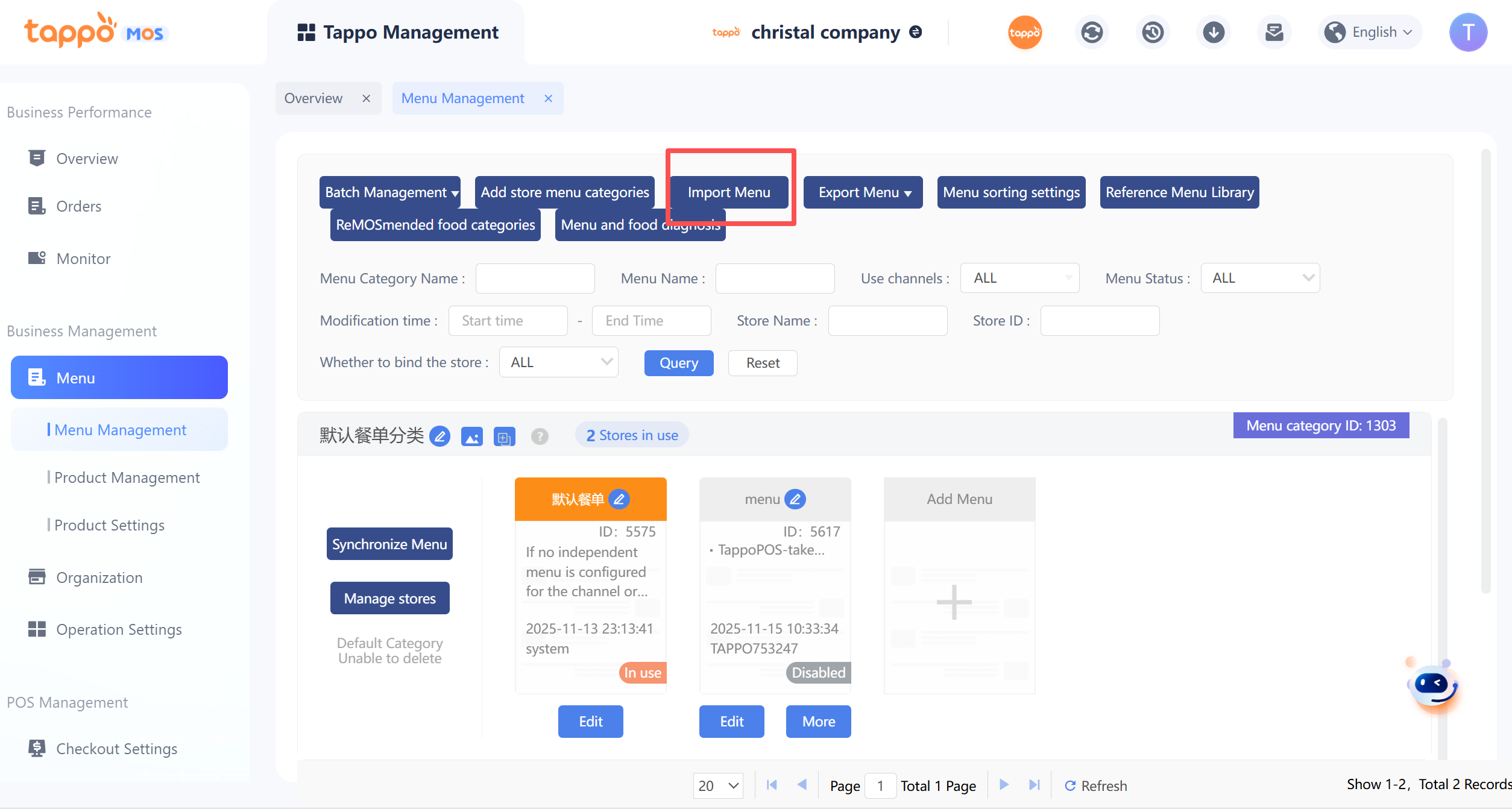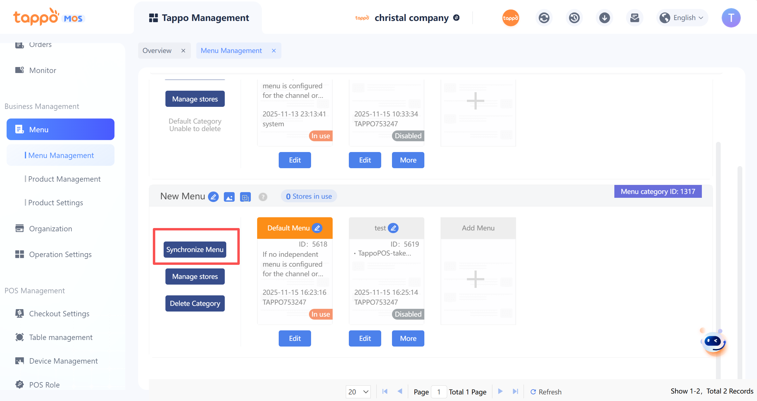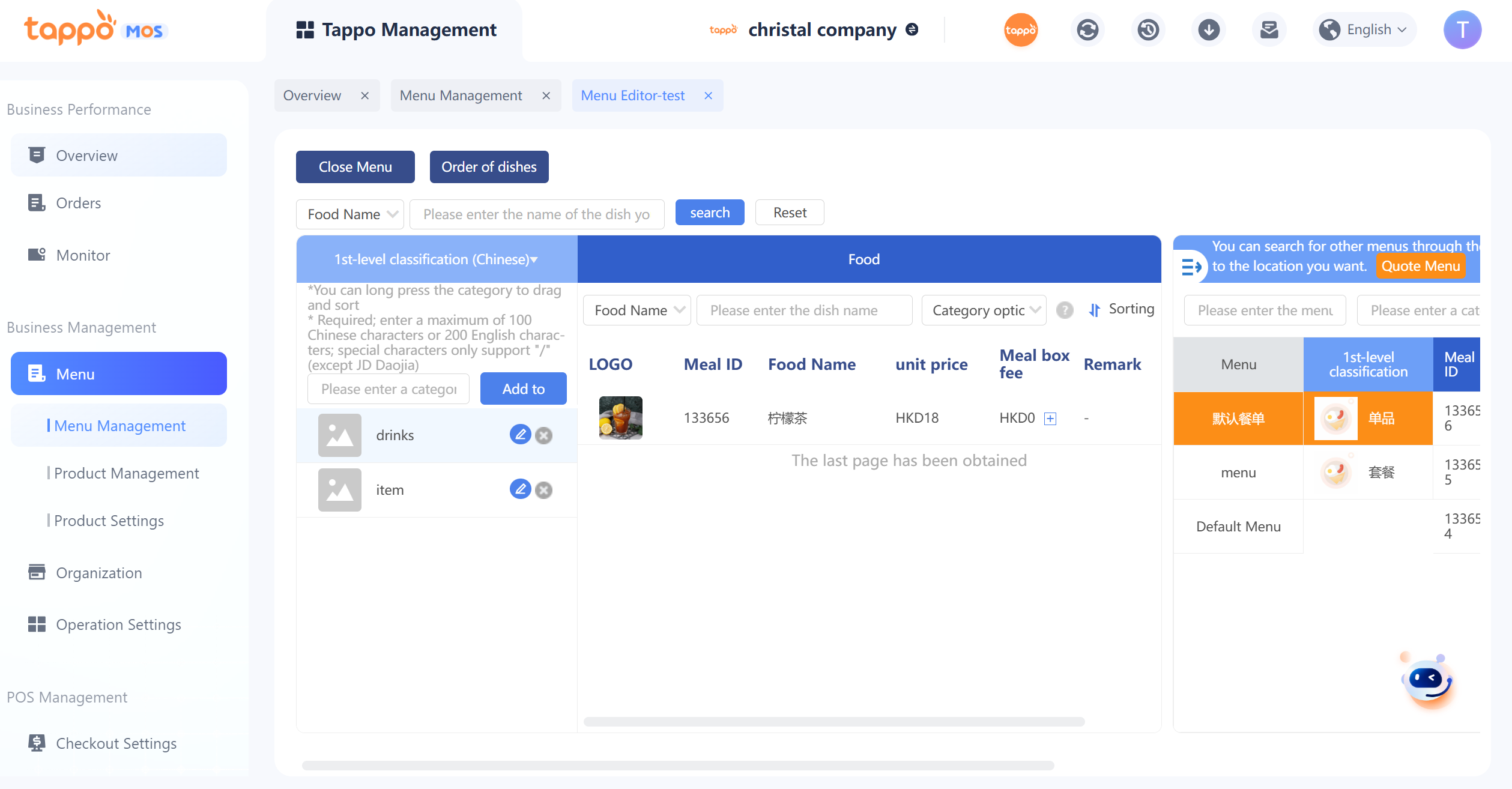 1. Default Menu Category: Each brand has a default menu category that cannot be deleted. Newly created stores are automatically bound to the default menu category.