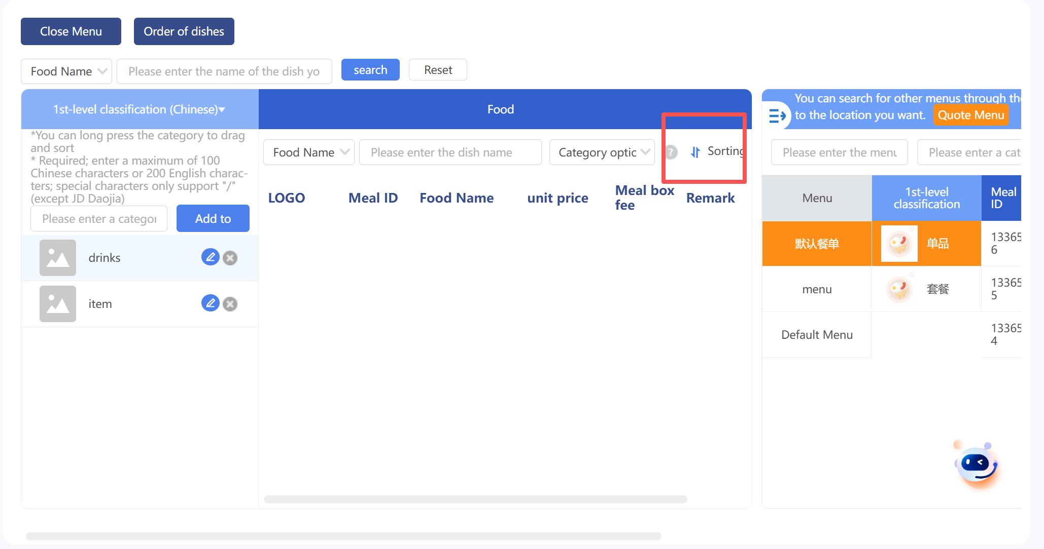 You can edit the menu, including adding/removing categories, adding/removing dishes, modifying dish unit prices, packaging fees, and sorting order. You can drag dishes to the specified category to move them to other categories. The right side is the search panel, which can search for dish categories and dish information from other menus of the brand and support copying to the current menu.