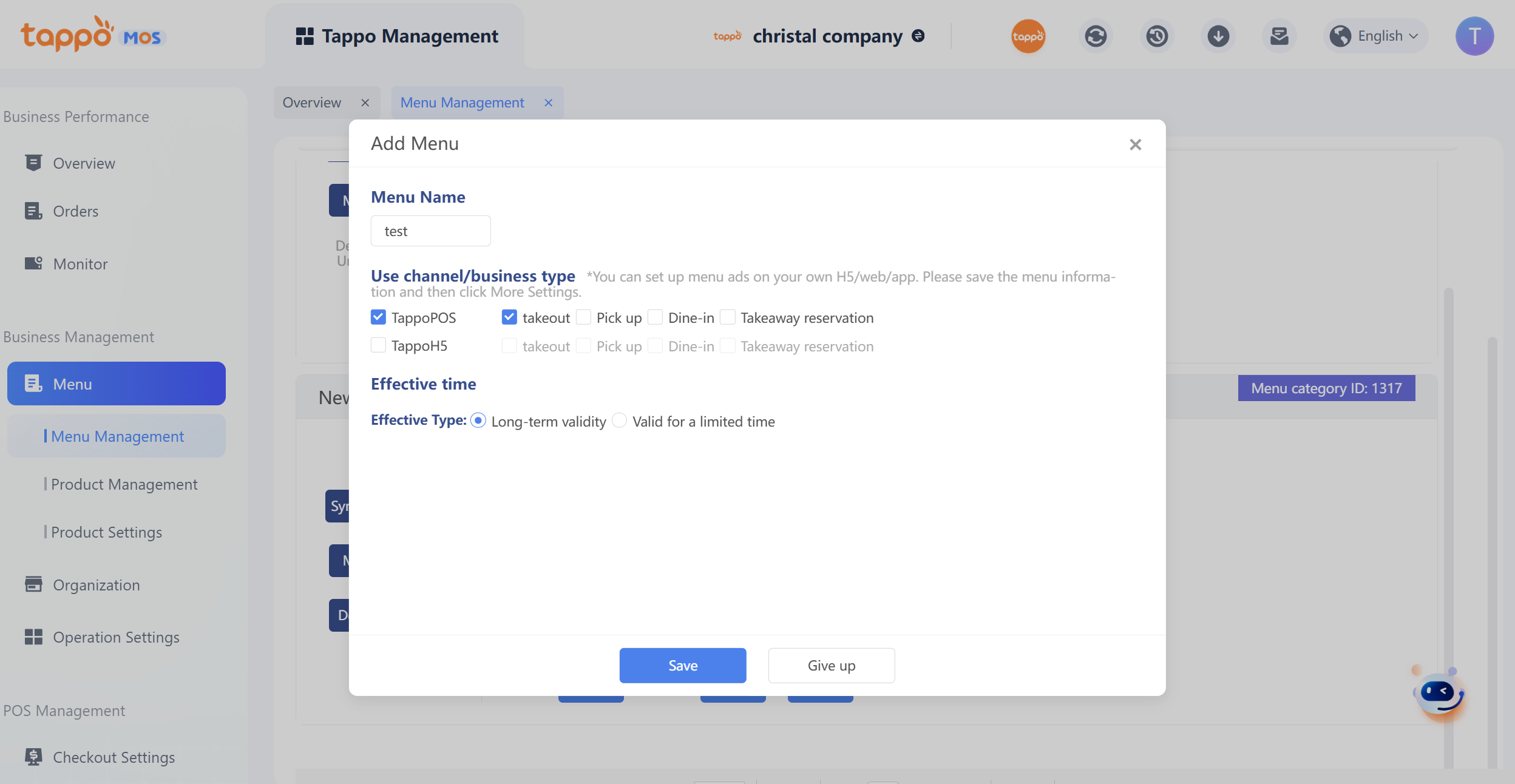 2. Enter the menu name, select the channel or business type, and click Save, as shown in the figure below. If an independent menu has already been configured for the channel or business type, it cannot be created again.