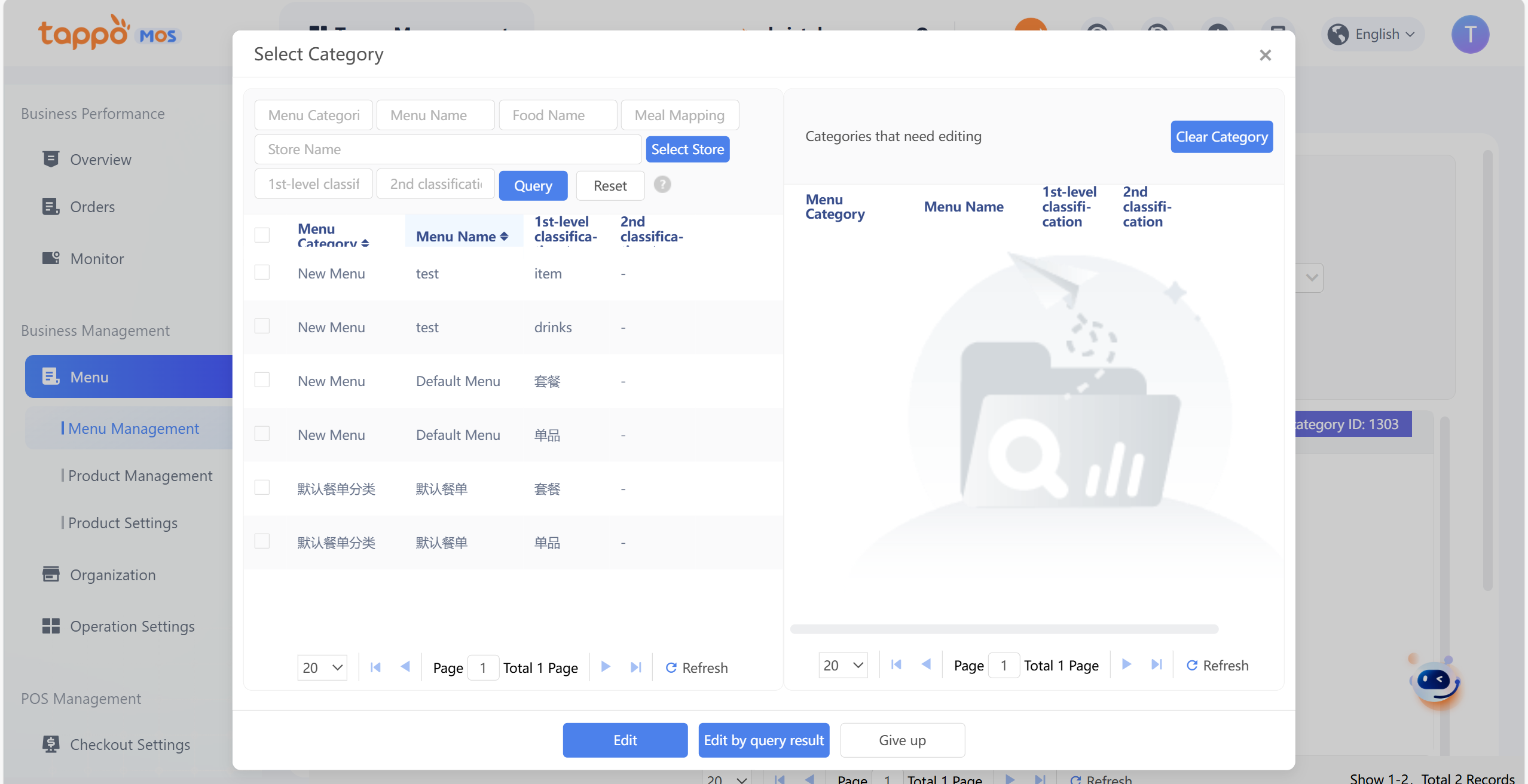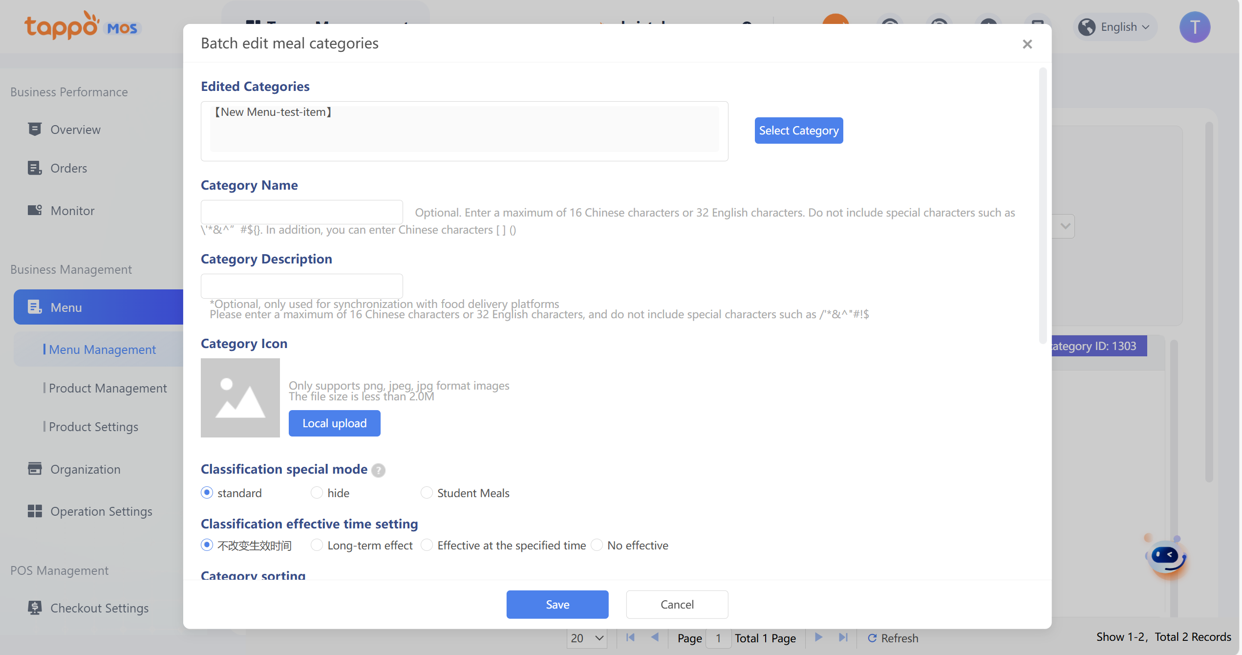 Click [Batch Management] – [Batch Edit Meal Categories] to pop up the category selection window.