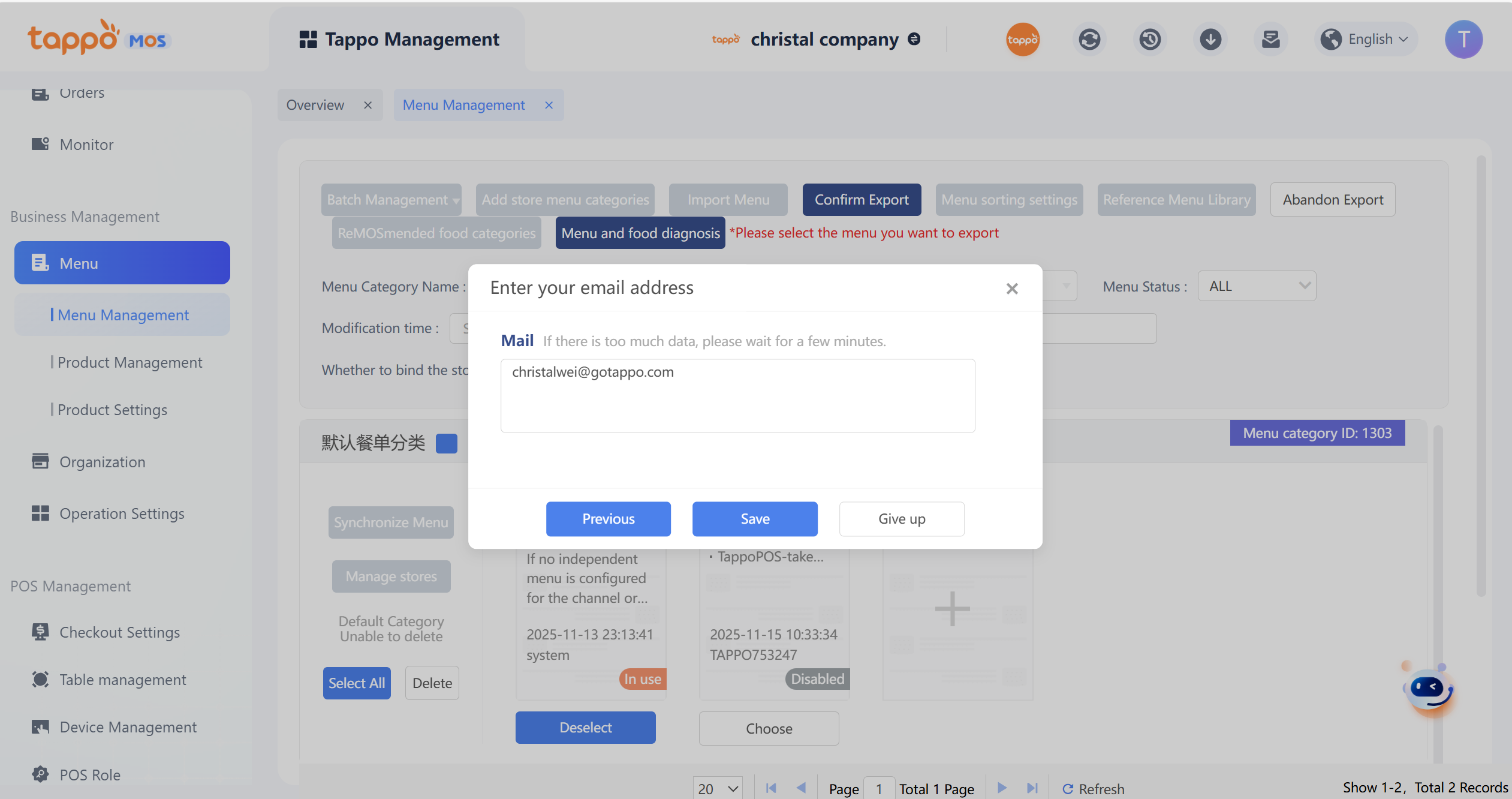 Click [Confirm Export], enter the corresponding receiving email, and the export of the corresponding menu can be completed.