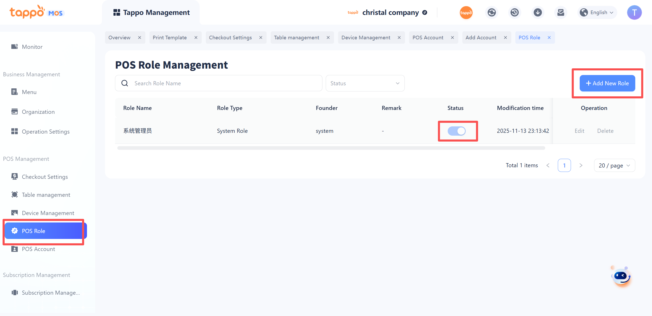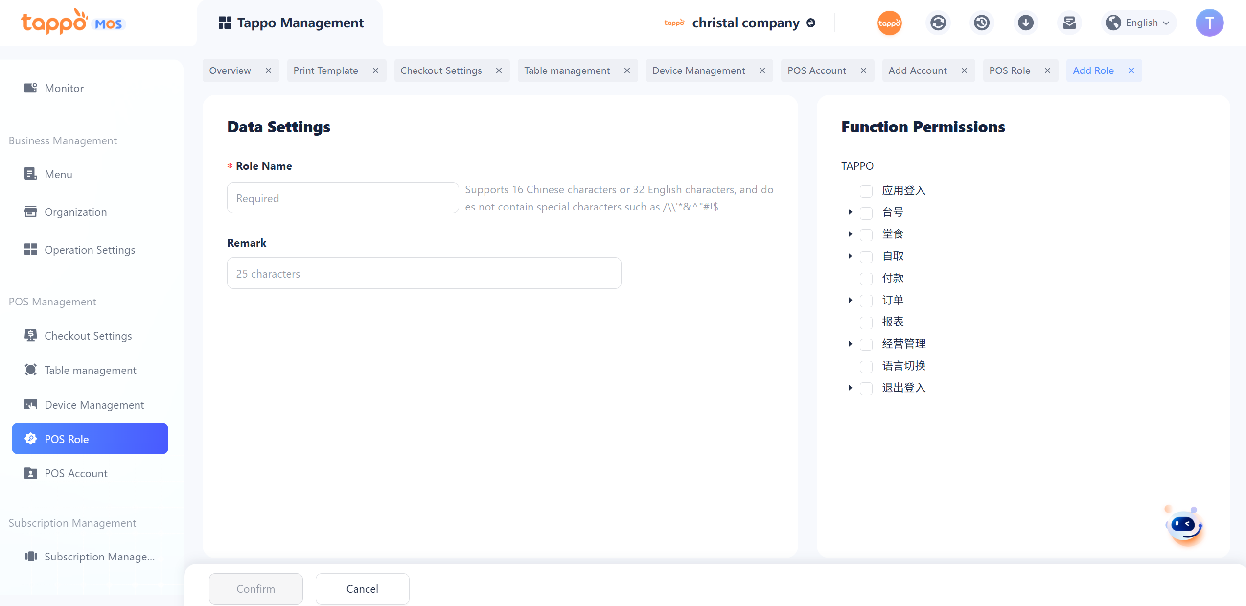 Path: Tappo Terminal Management -> Organization -> POS Role Management