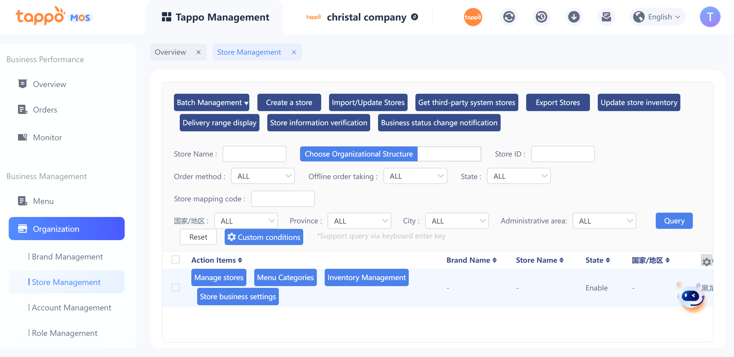 Displays all stores under the brand. Operations such as editing store information, viewing menus, and inventory management can be performed.