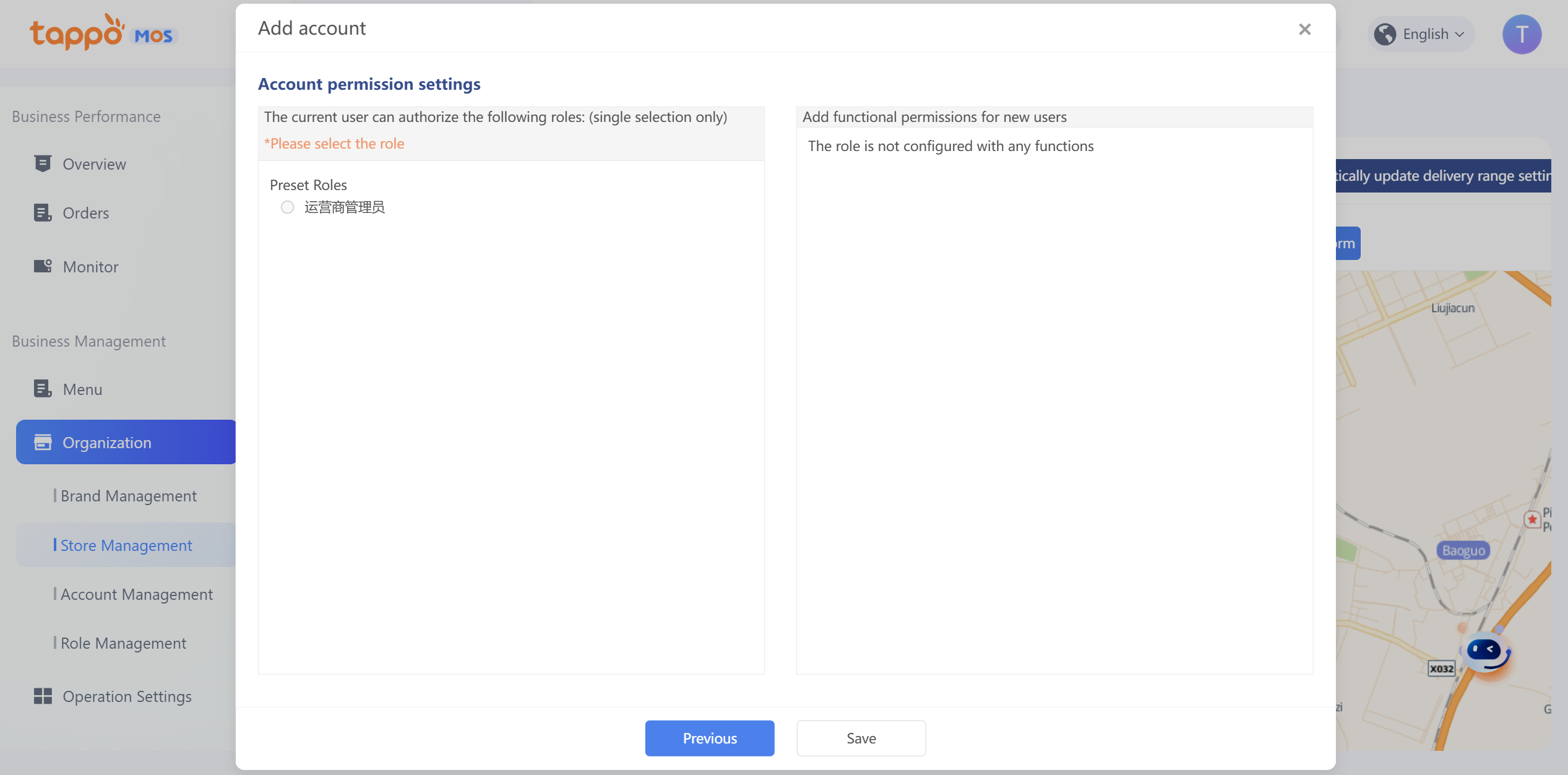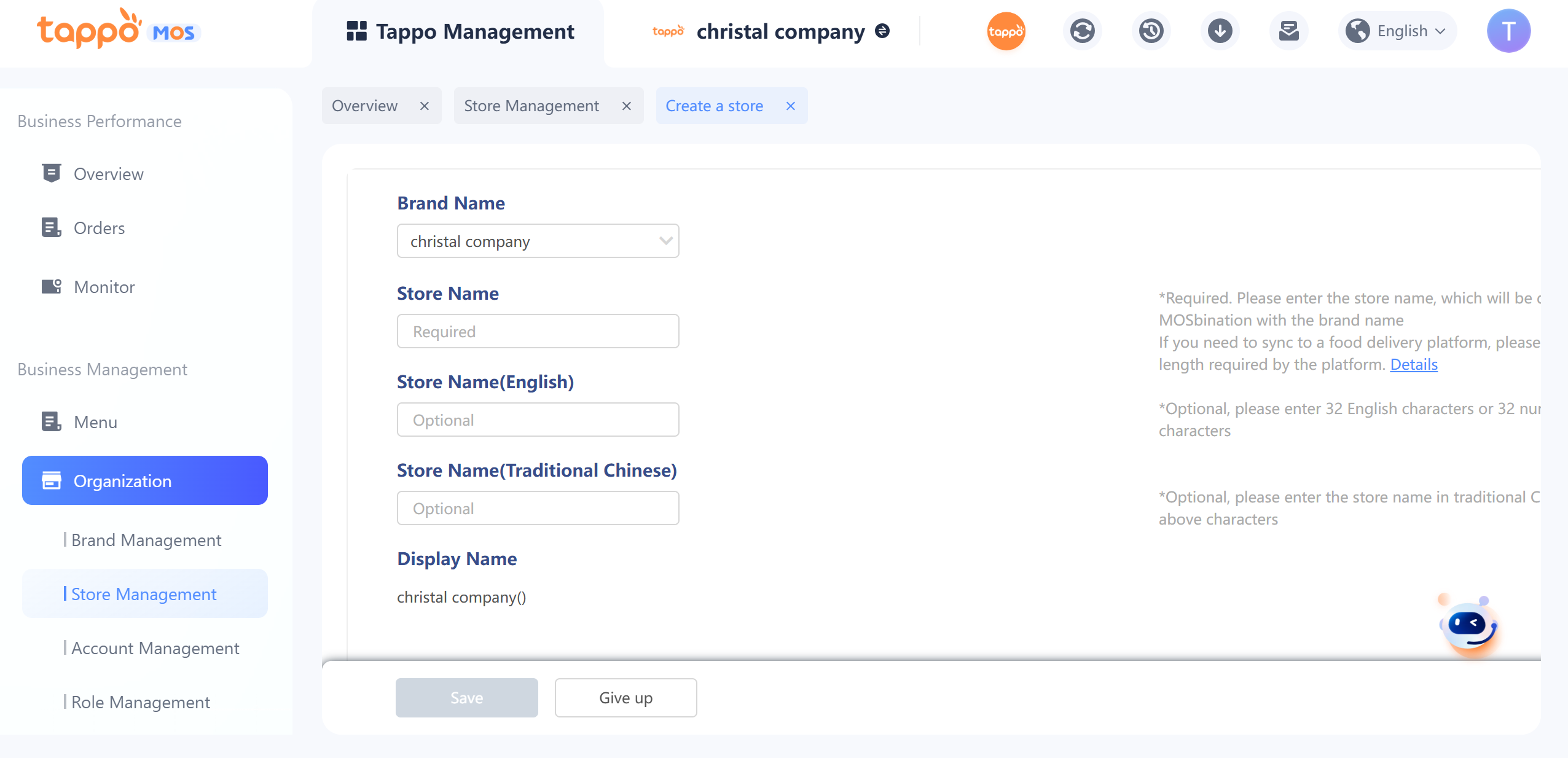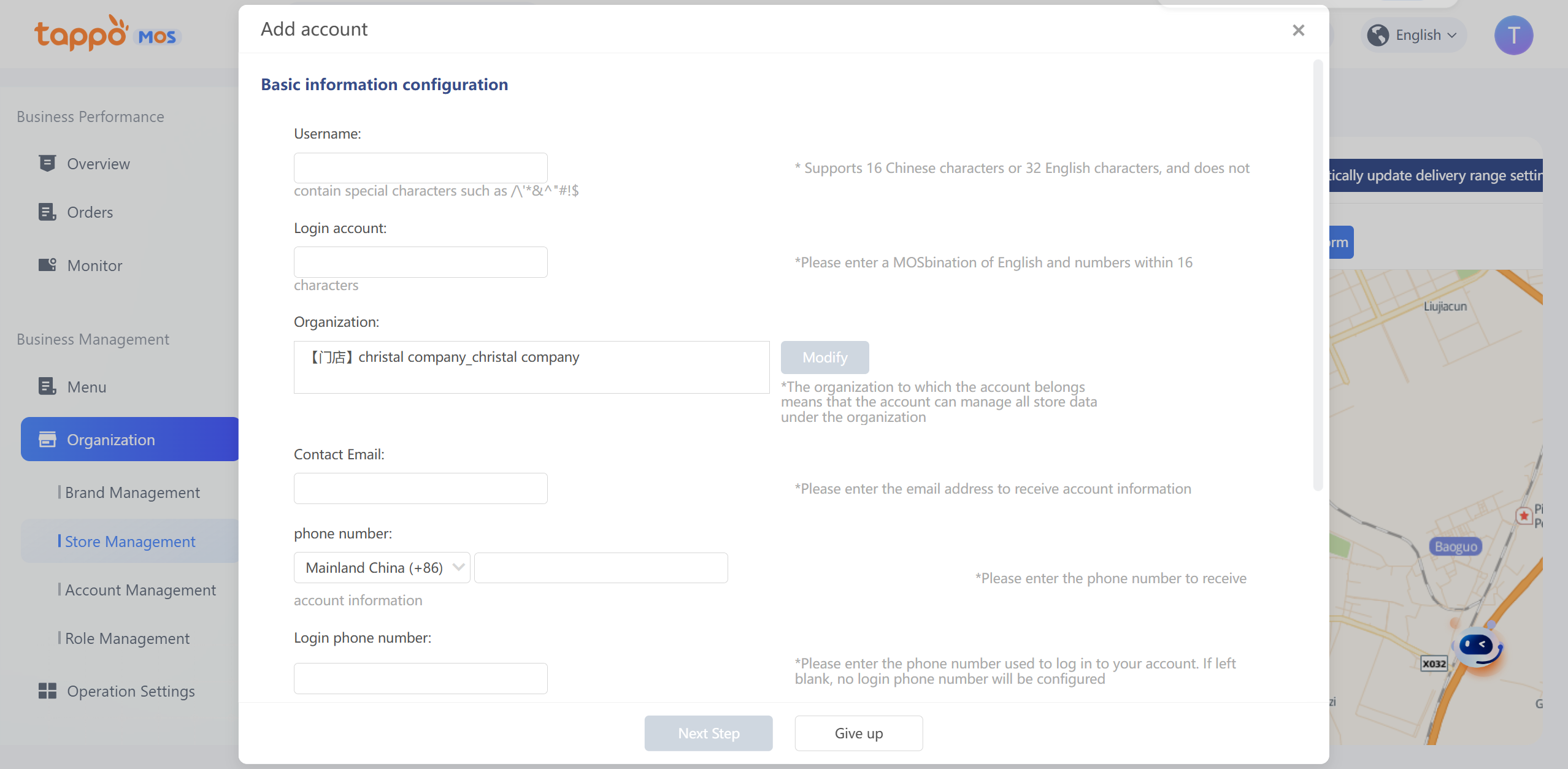 • Click Save to complete the creation of the Tappo POS order acceptance account. This account can log in to the MOS terminal.