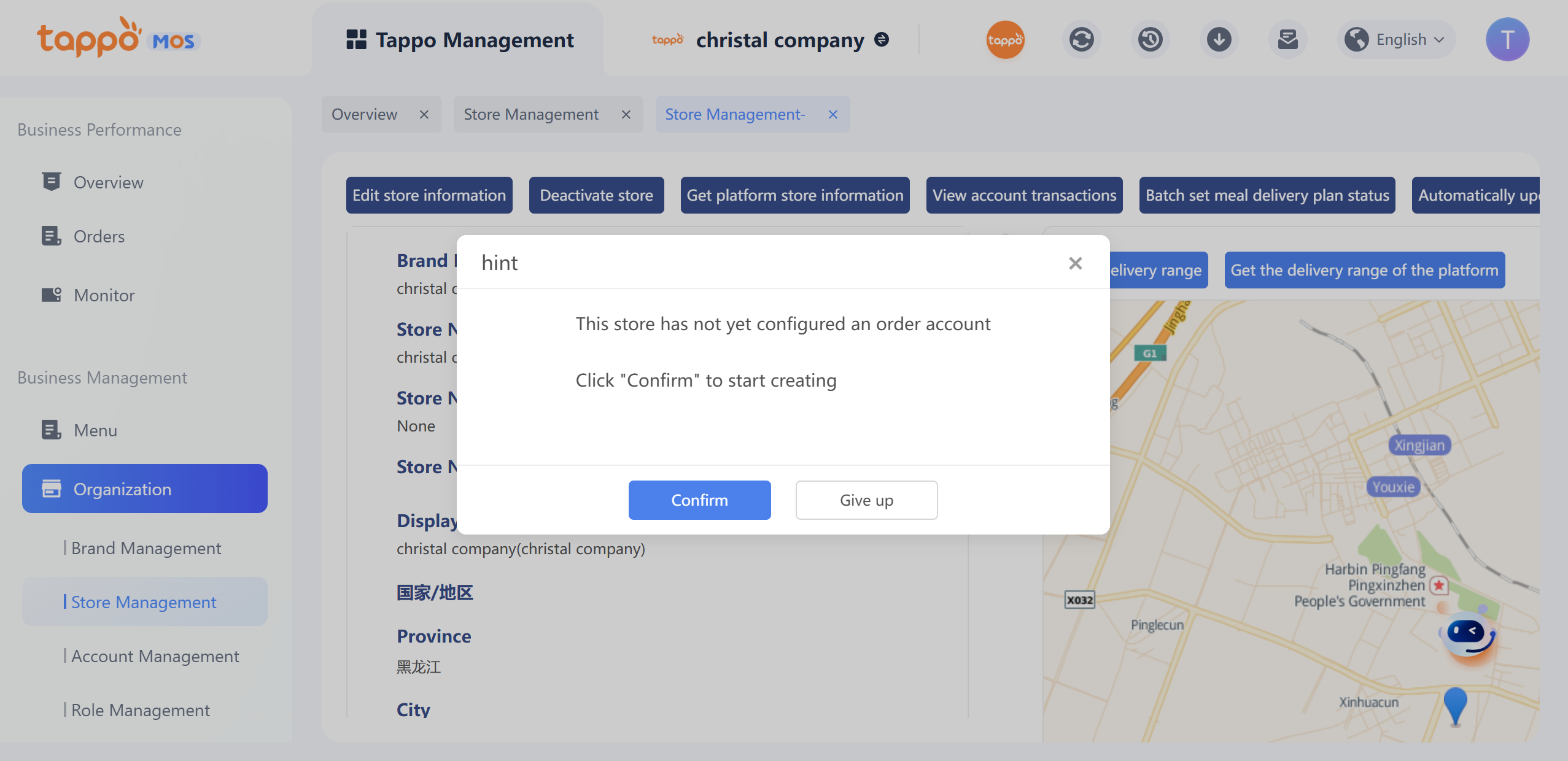 Click [Manage Store] in the store list to enter the store viewing page. If the store is set to accept orders via Tappo POS and no order acceptance account is set, the system will prompt to create a Tappo POS order acceptance account. Click Confirm to jump to the creation window.