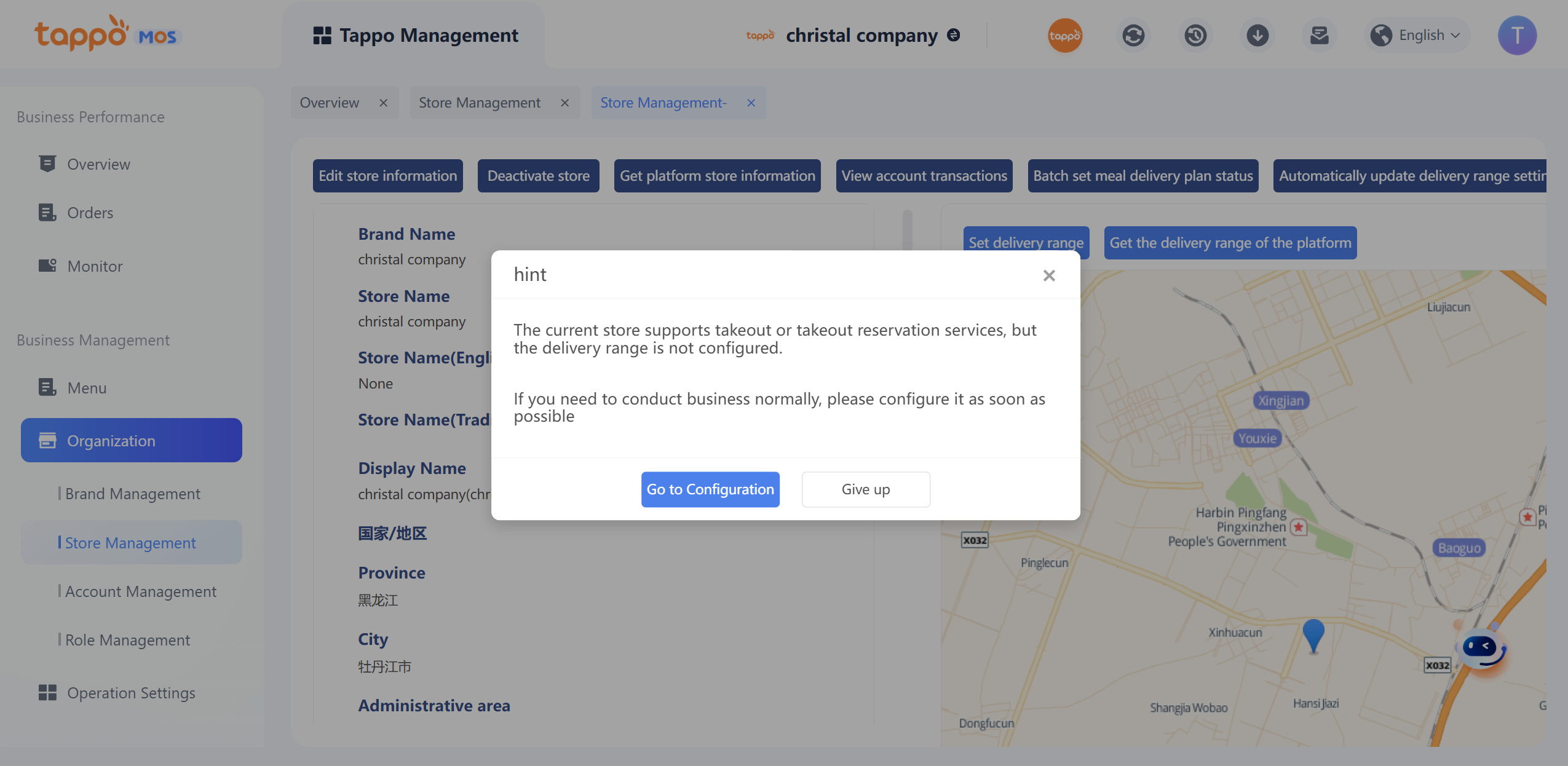 When the store’s business type supports “Takeaway” or “Scheduled Takeaway”, a prompt to create a delivery range will appear when entering the store management page. If the delivery range has been configured, you can view and edit it through the right side of the store management page.