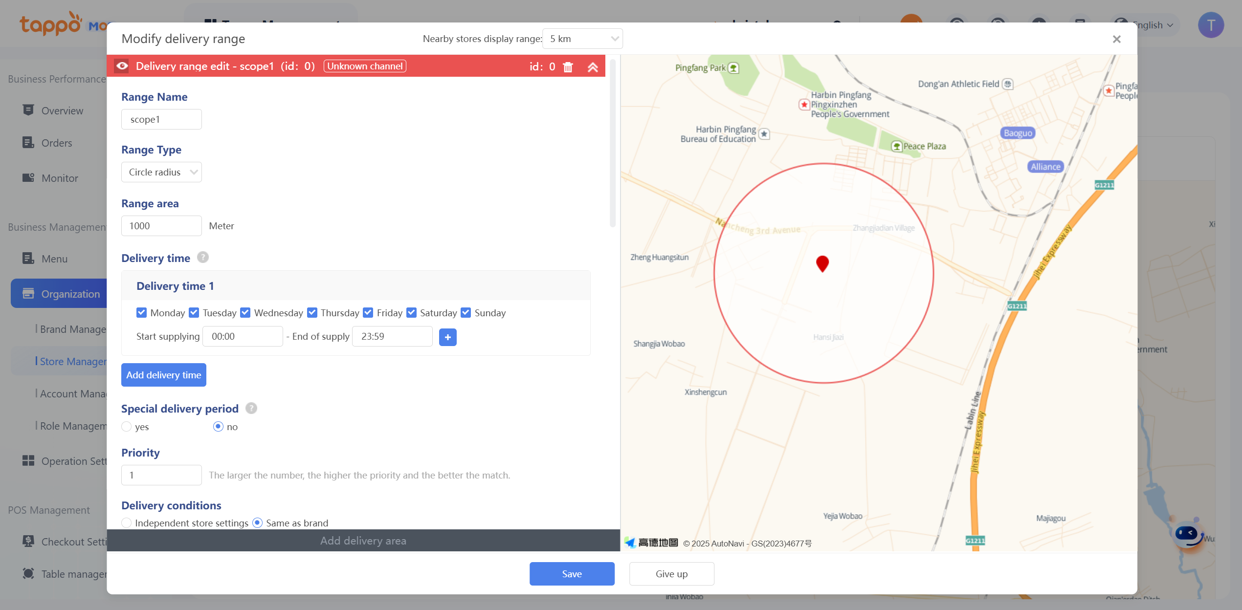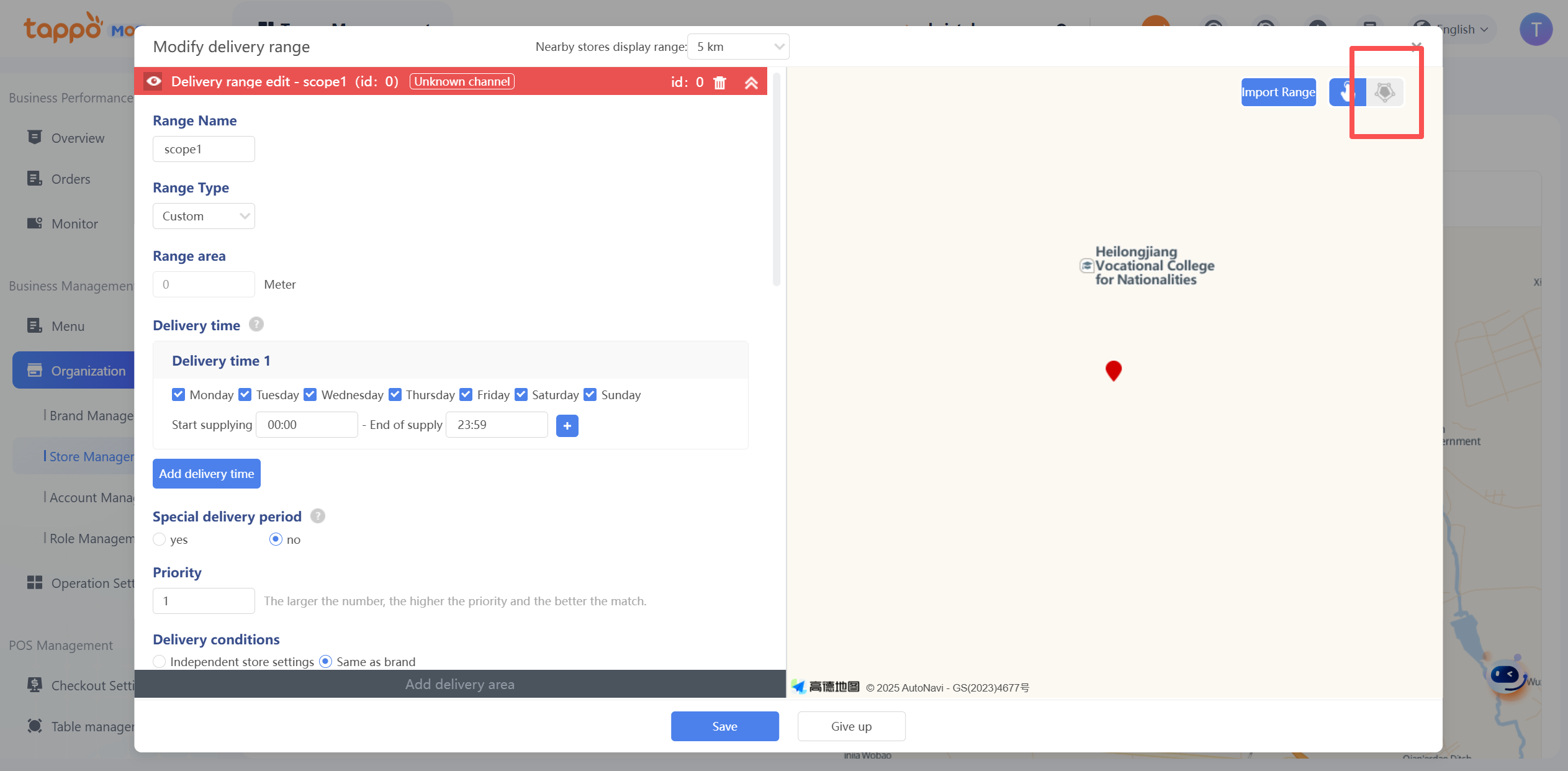 • Select Range Type: Can select Custom/Circular Radius/Whole City Delivery.