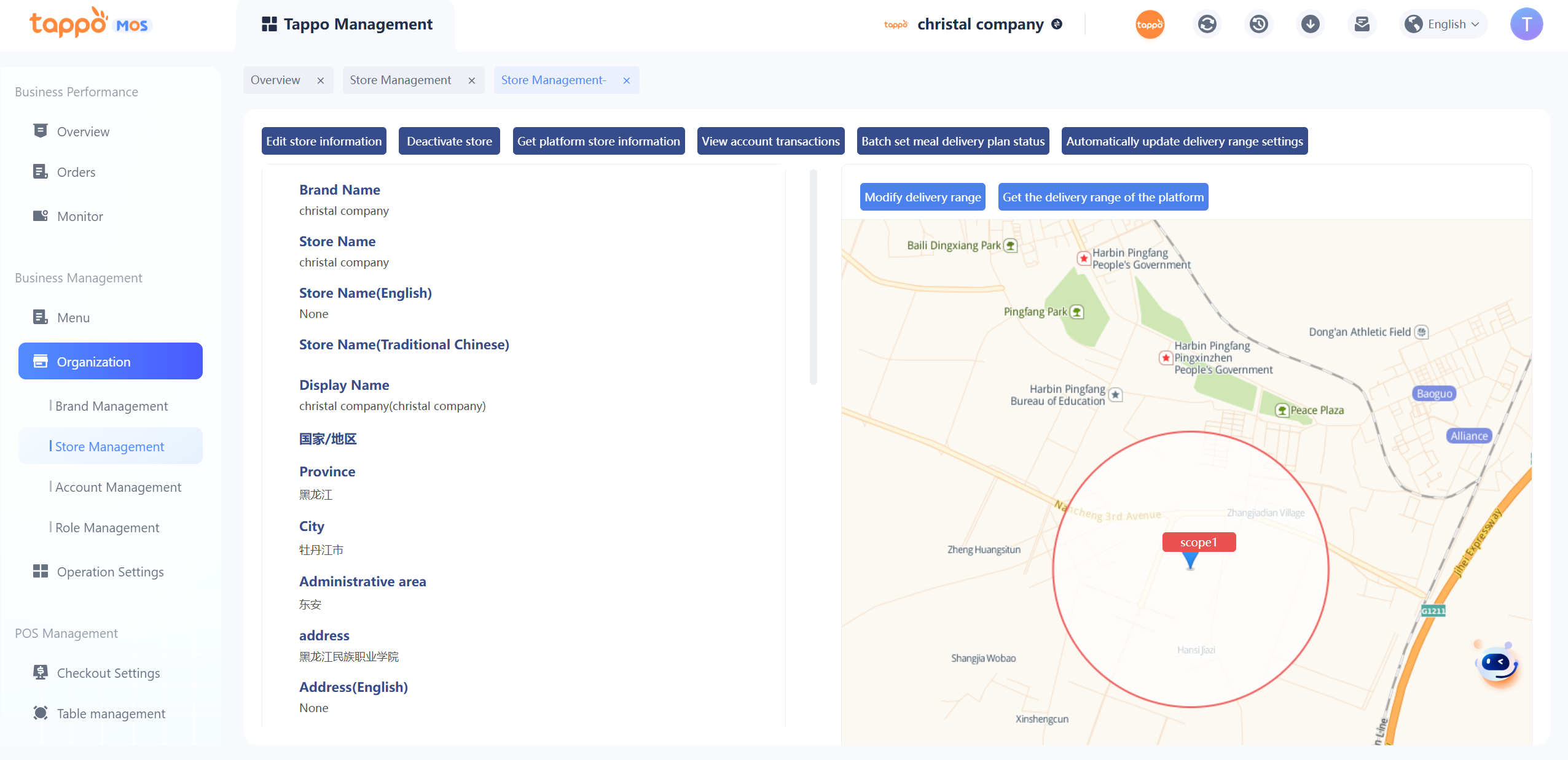 Click Save, and the store’s delivery range will take effect immediately on self-operated channels. The range information can be viewed on the store management page, as shown in the figure below. If you need to synchronize it to food delivery platforms, go to Third-Party Management – Food Delivery Platform Synchronization Management to synchronize the store’s delivery range.