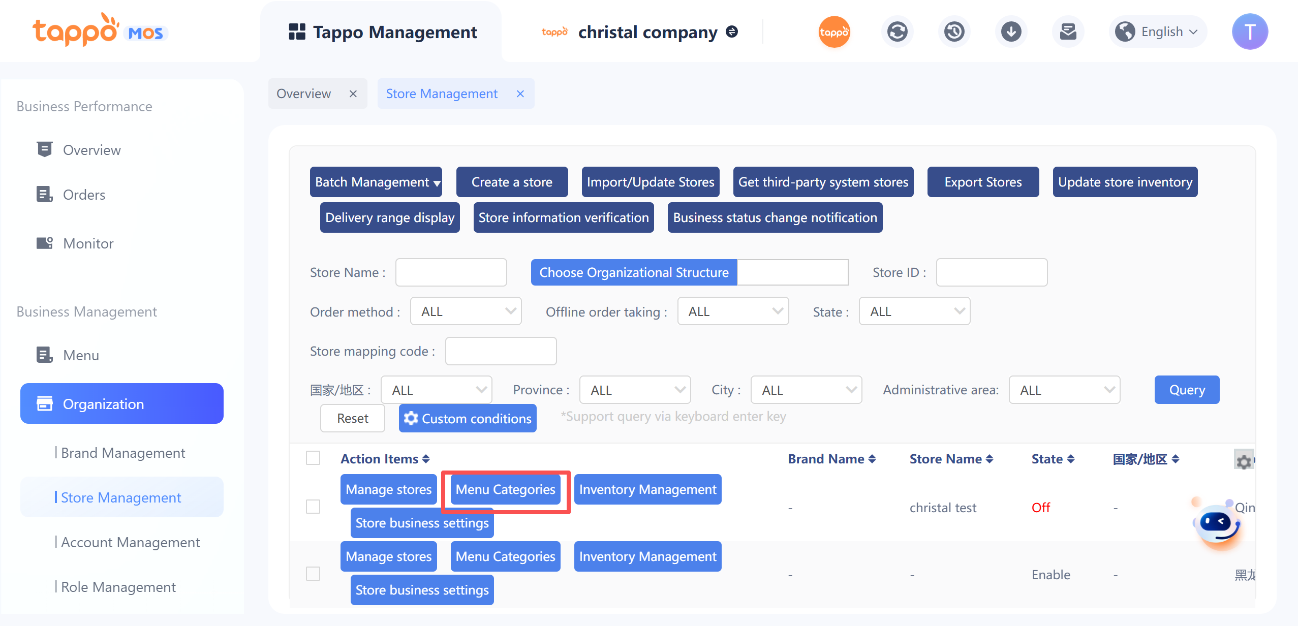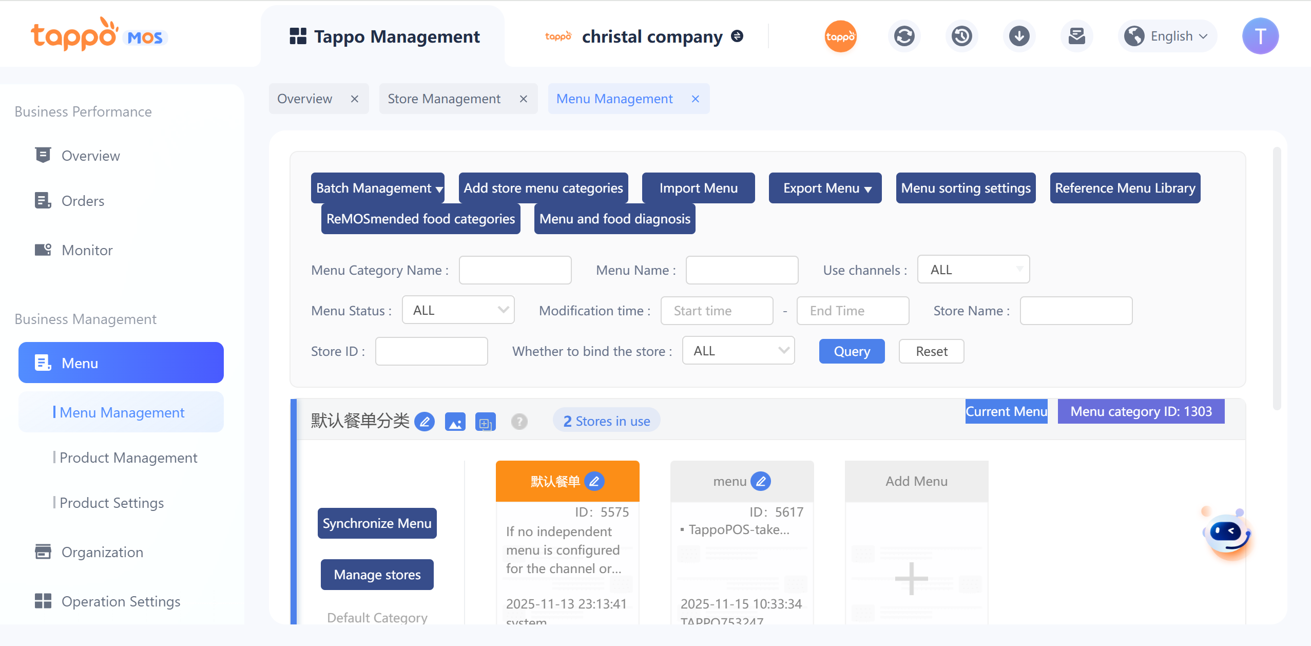 On the store list page, click the [Menu Category] button of the store to open the menu list. The first selected item is the menu category to which the store belongs, as shown in the figure below.