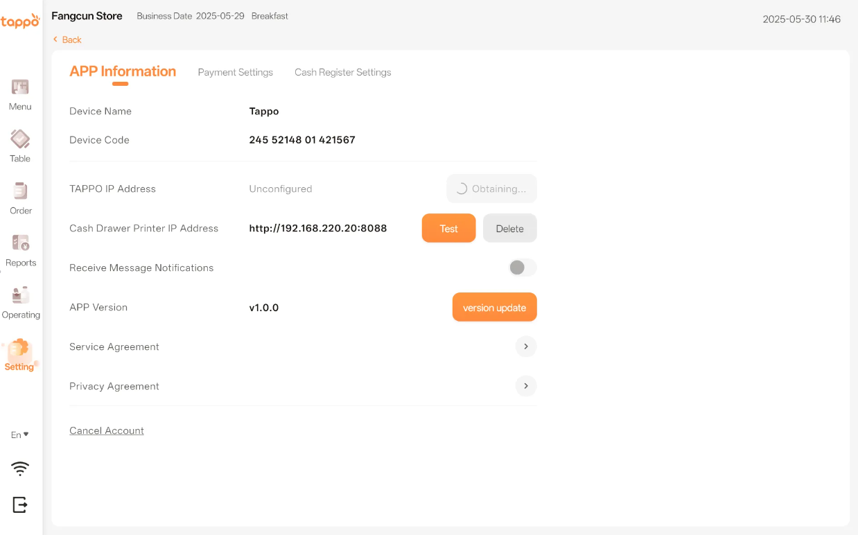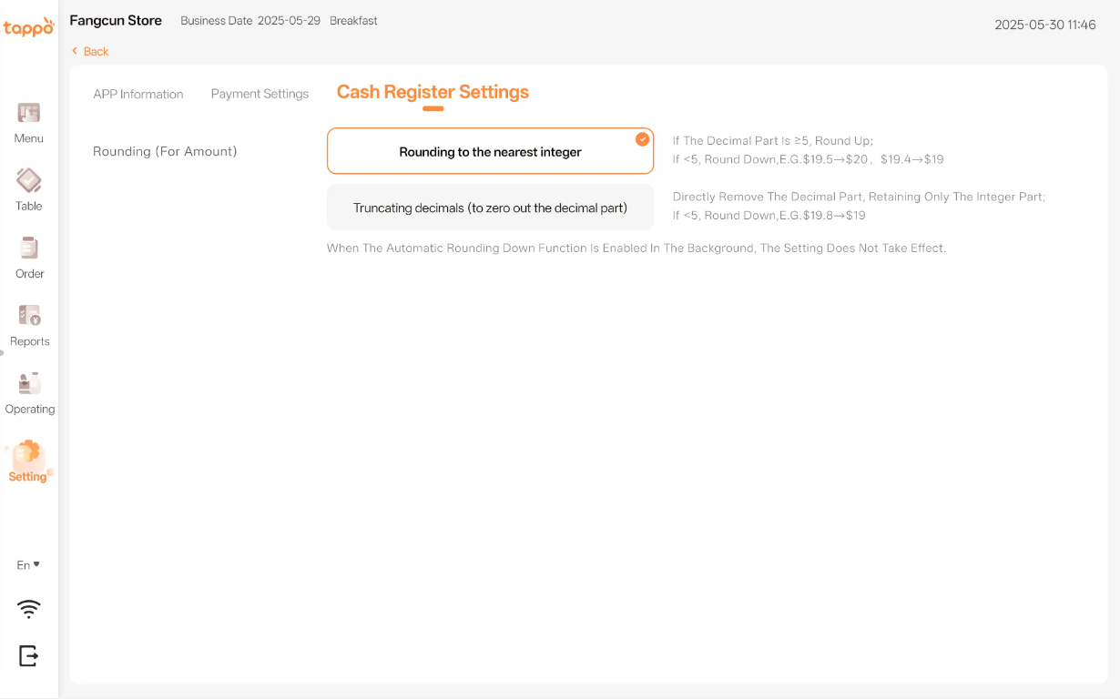 1) If auto rounding is not configured in the MOS backend’s Cashier Settings, rounding can be set in Tappo POS’s Cashier Settings. See configuration in the POS Management -> Cash Register Settings function of MOS(商家管理後台). 2) If auto rounding is enabled in the MOS backend’s Cashier Settings, Tappo POS will use auto rounding, and the settings here will not take effect. 3) Currently supports rounding up/down or truncating decimals.