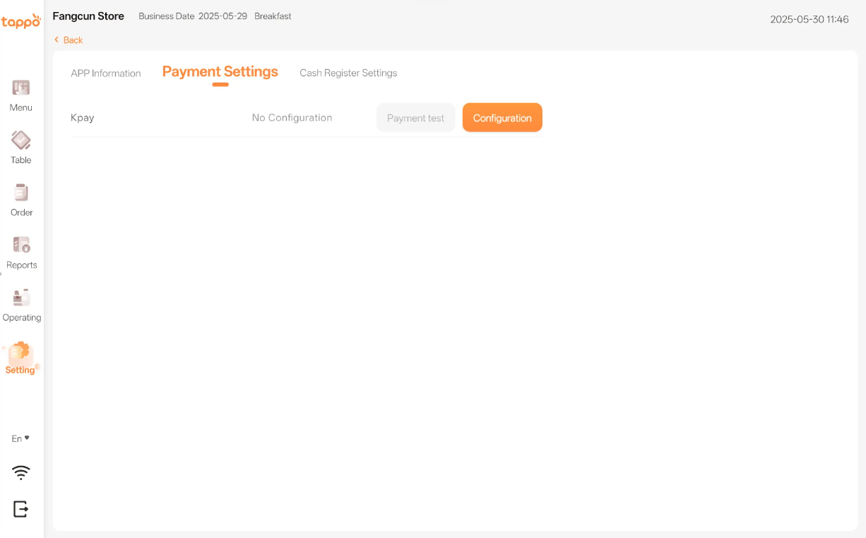 Configure the IP address of the Kpay payment terminal here. The Kpay terminal can only be used for payment after configuration.