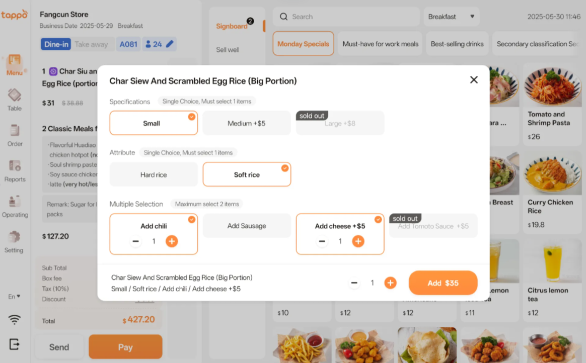 b. Item with Special Requirements: Click the dish, and a dish attribute pop-up window will appear according to the configuration in MOS, providing options for special requirements.