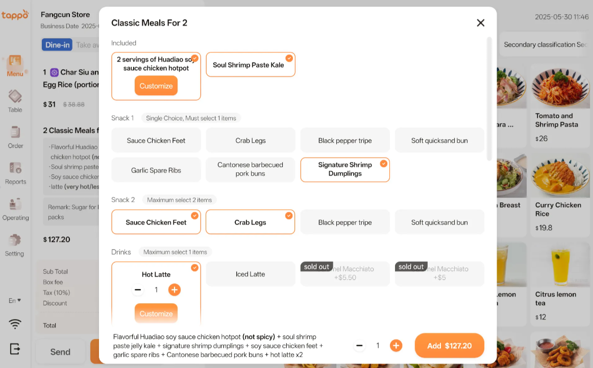 c. Combo: Click the dish, and a set meal sub-dish pop-up window will appear according to the configuration in MOS, providing options for sub-dish contents.[Image]