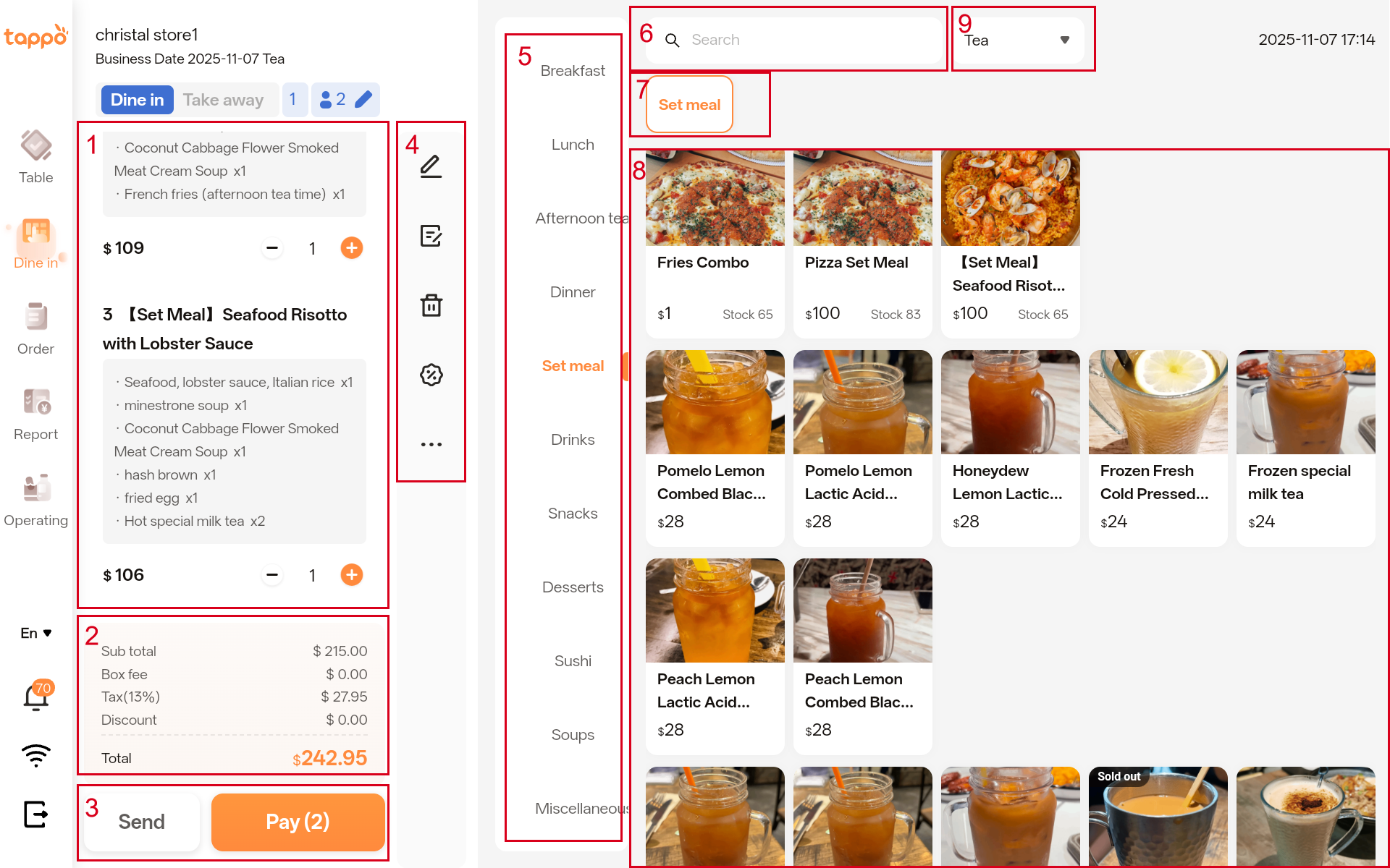 a. Send: For scenarios where ordering is done first and payment later, click [Send Order] to send the dishes to the kitchen for preparation first, then process the order payment later.