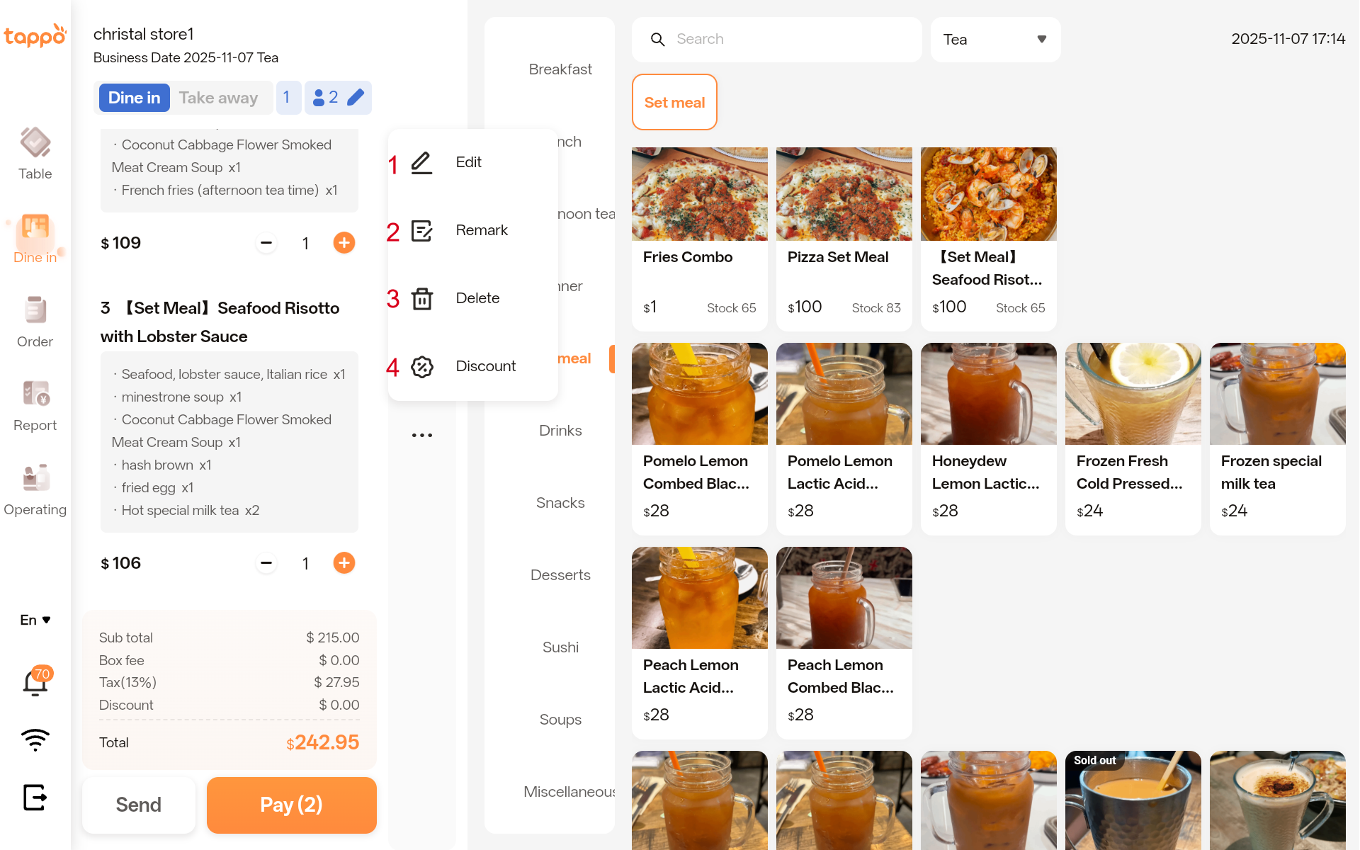 d. Discount: After selecting a dish in the shopping cart, you can apply a custom discount to the dish.