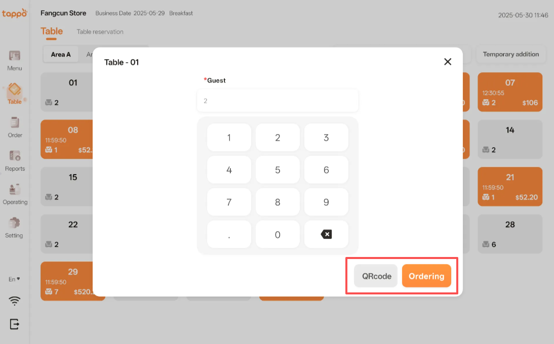 When the restaurant offers dine-in services and has table numbers, table ordering can be used. For table number management, see Section IV: Table.