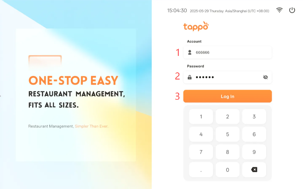Generic selectors Exact matches only Search in title Search in content Post Type Selectors HomeHelp GuidesTAPPO POSLogin Device Binding/Activation/Login POS Device Binding Activation Process Time Zone Verification Time Verification Login New User Registration New User Registration Ordering Dine-in – Non-Table Ordering Dine-in – Table Ordering Takeaway – Ordering Table Table Area Search Table Temporary Addition Table Number List Payment Payment Orders Orders Reports Reports Operations Inventory Management Daily Closing Printer Management Message Notifications App Settings Open Cash Drawer & Close App & Restart App Subscription Management New User Task Hamburger Toggle Menu Login 1. AccountCreated in the Organization -> POS Account Management function of MOS(商家管理後台).2. PasswordCreated in the Organization -> POS Account Management function of MOS(商家管理後台).3. LoginEnter the account and password, then click [Login]. If the account and password are verified successfully, you will enter the POS ordering page. Help us give you a better customer experience. Send