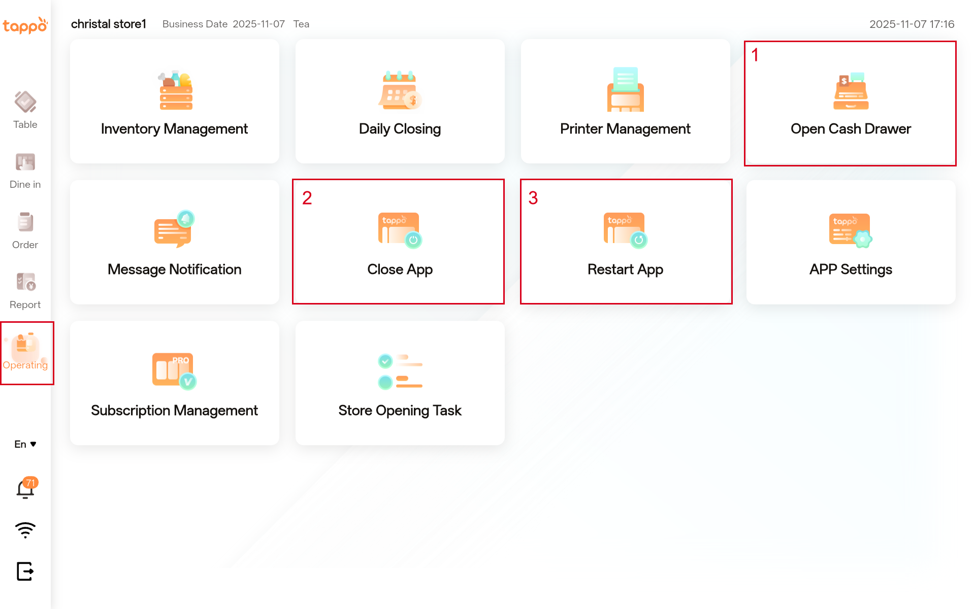 Click [Restart App] to quickly restart Tappo POS. Note: This function is only available on the Android app; it is not yet available on the iOS app.