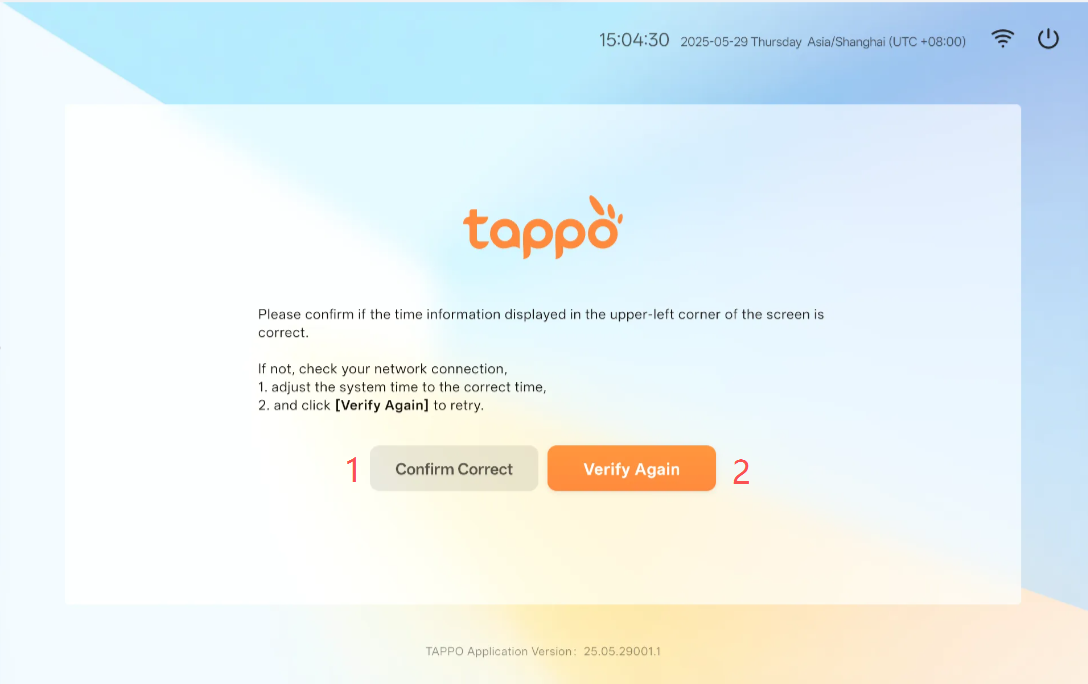 If the system has no network, the app cannot obtain the network time, and the user needs to judge whether the time is correct. If confirmed correct, click [Confirm Correct] to proceed to the next step.