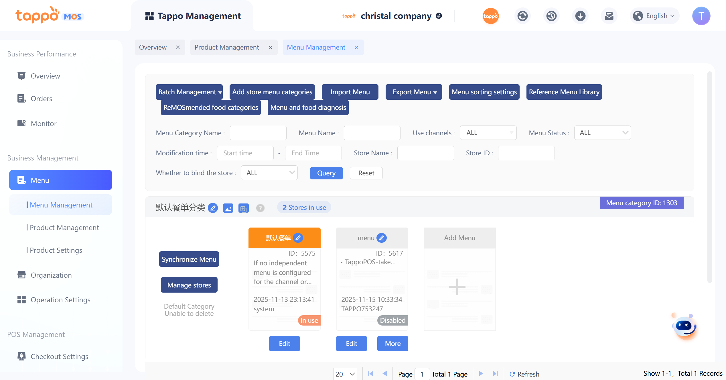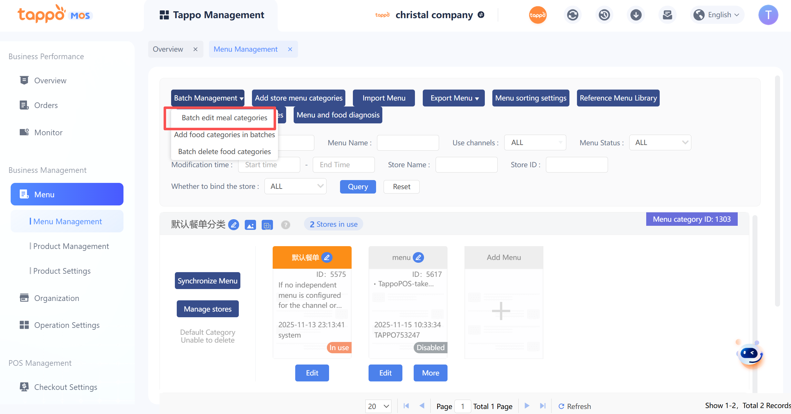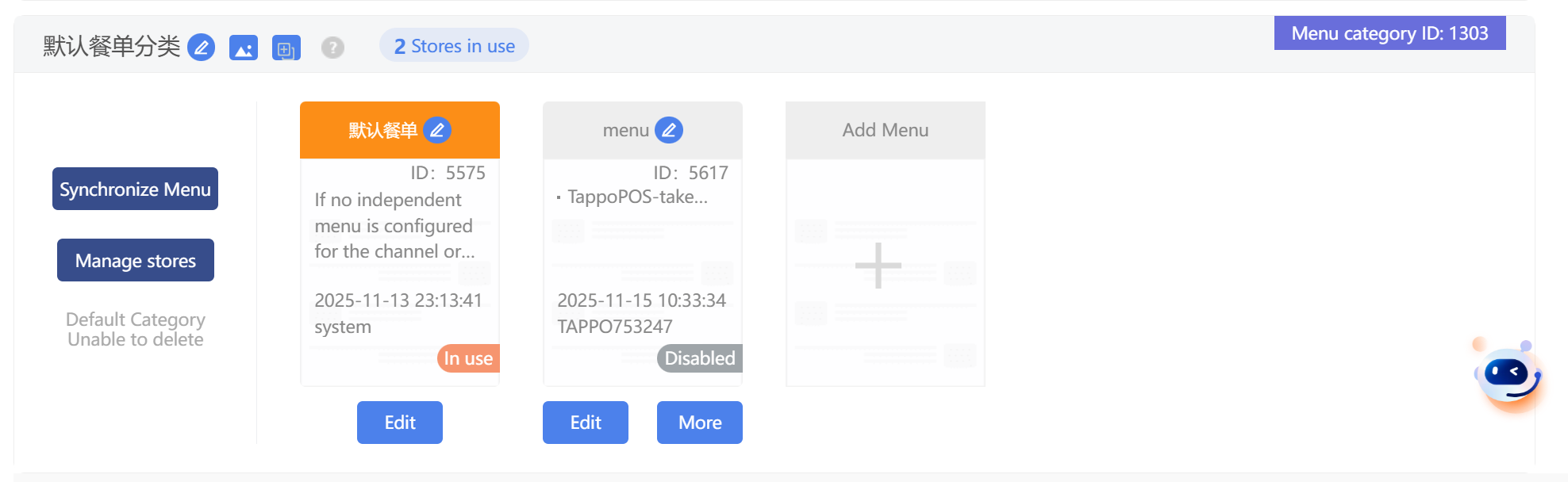 1. 默認餐單分類:每個品牌都有一個默認餐單分類,不能刪除。新建門店默認綁定在默認餐單分類中。