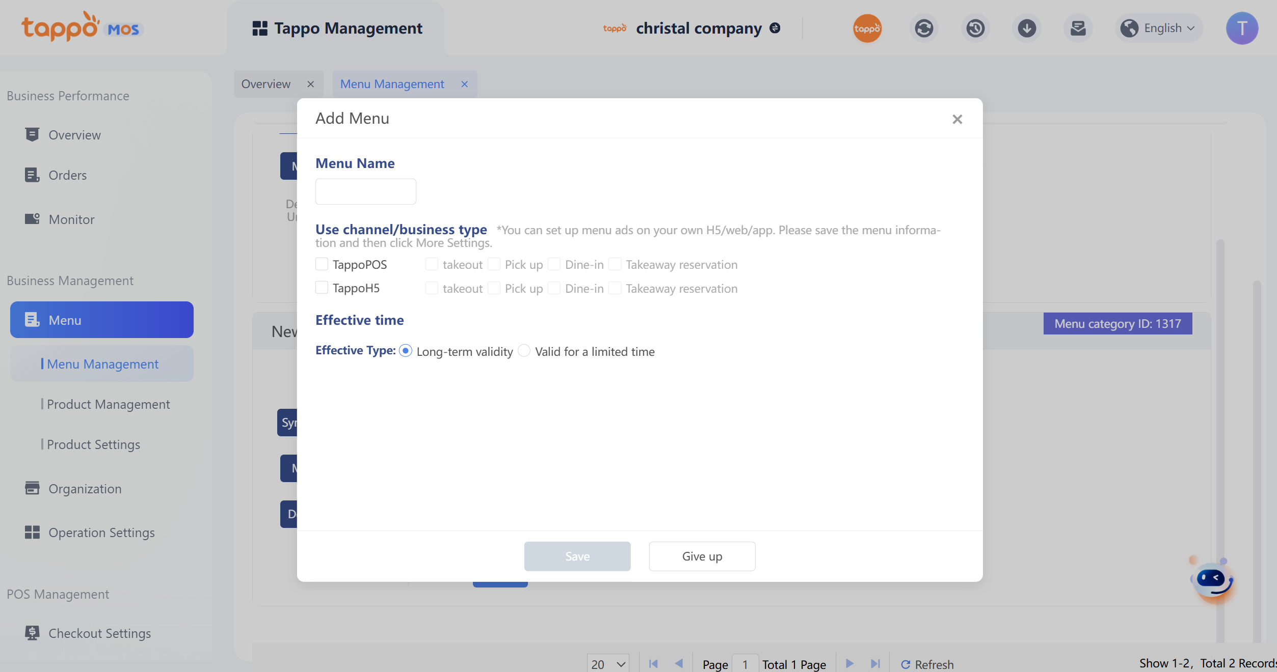 2. 輸入餐單名稱,選擇渠道或業務類型,點擊保存,如下圖所示。若渠道或業務類型已配置了獨立餐單,則無法再創建。