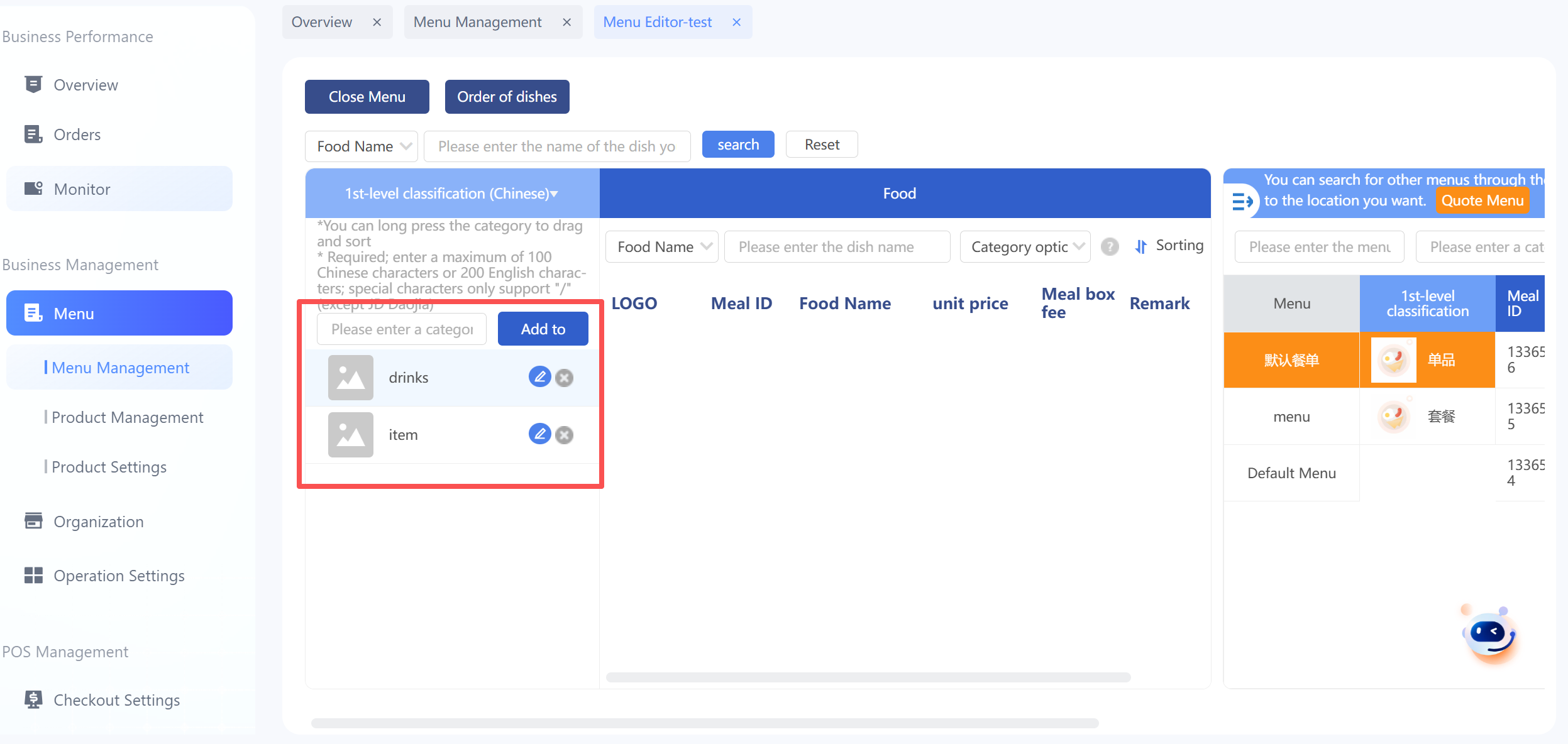 可對餐單進行編輯,包括增刪分類,增刪餐品,修改餐品單價、餐盒費以及排列順序,可拖動餐品到指定的分類下,實現將餐品移動到其他分類,右邊為搜索板塊,可以搜索該品牌其他餐單的餐品分類和餐品資訊,並支援複製至當前餐單;