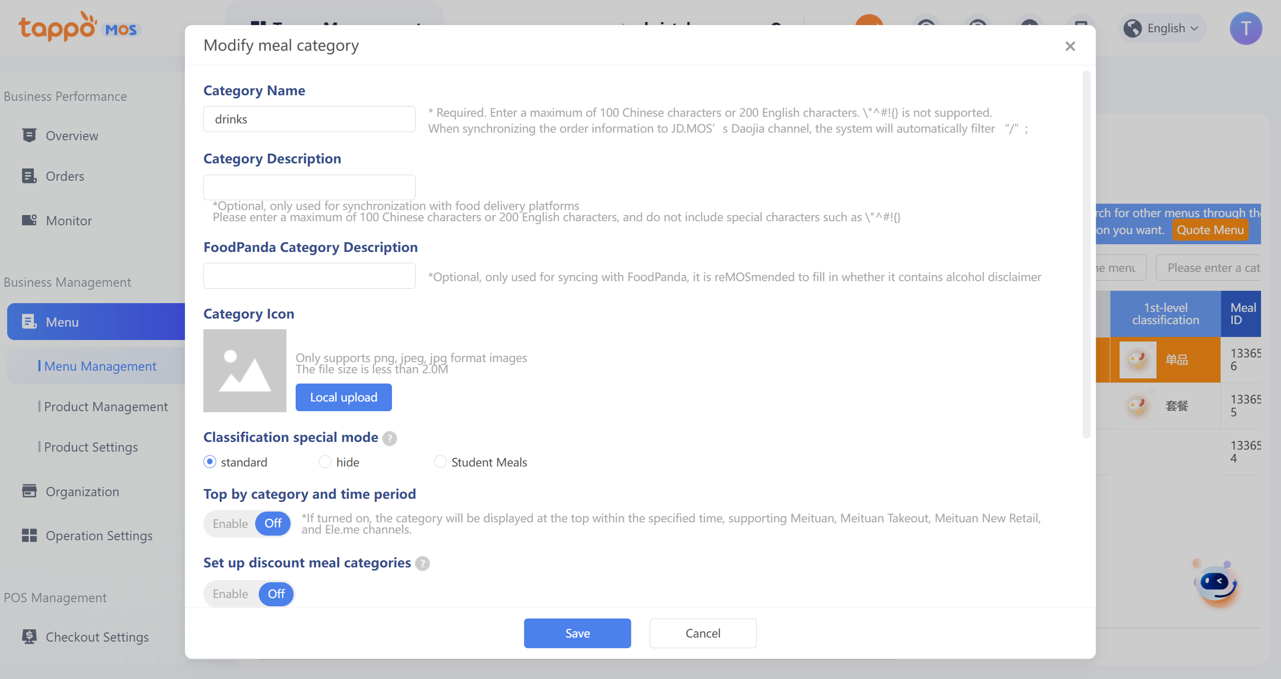 首次編輯餐單時可設置二級分類,添加任何餐品和餐品分類後則不能修改餐單是否包含二級分類。外賣平臺若不支援二級分類,若餐單中配置了二級分類,系統只同步一級分類至外賣平臺,若支援則同步一級二級至平臺。