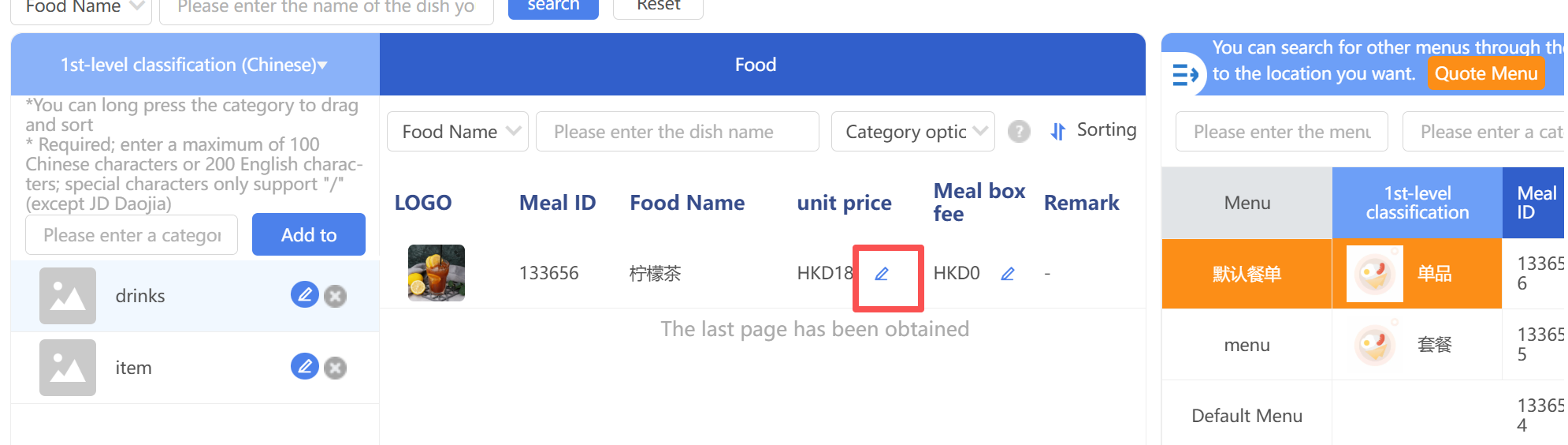 8. 若需調整餐品在該餐單中的價格及餐盒費,點擊餐品【編輯】按鈕修改