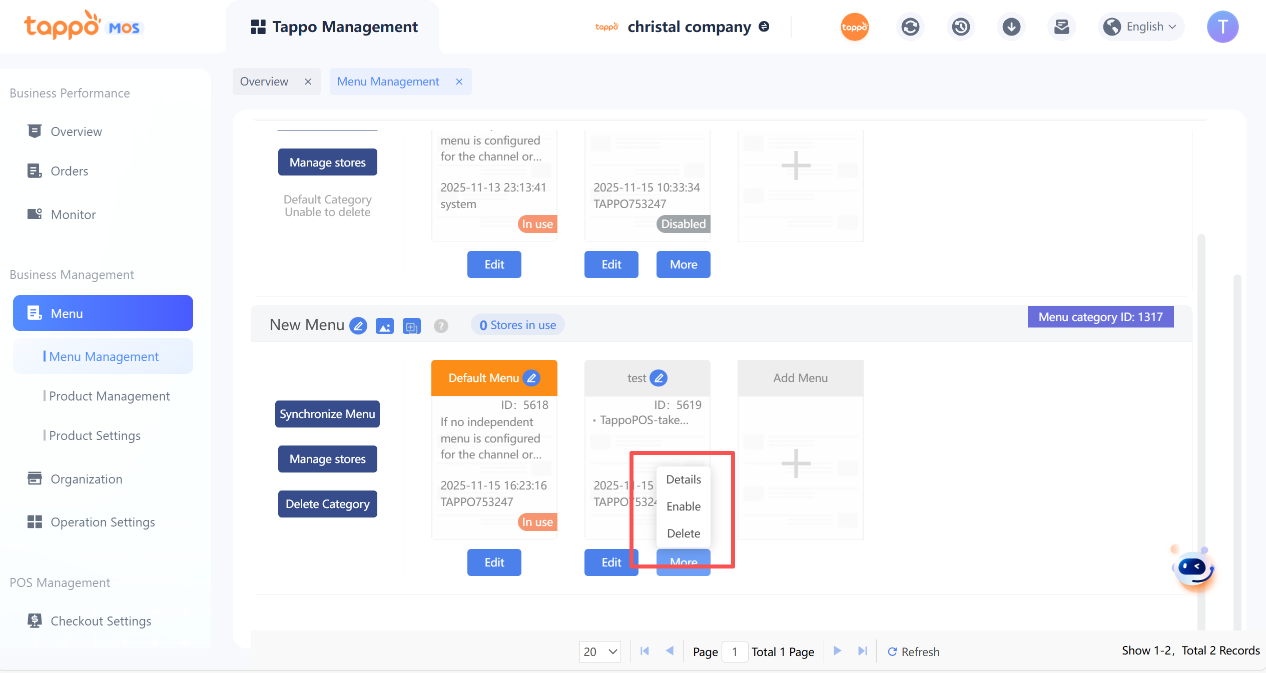 9. 點擊【保存餐單】按鈕保存餐單,預設為停用狀態。