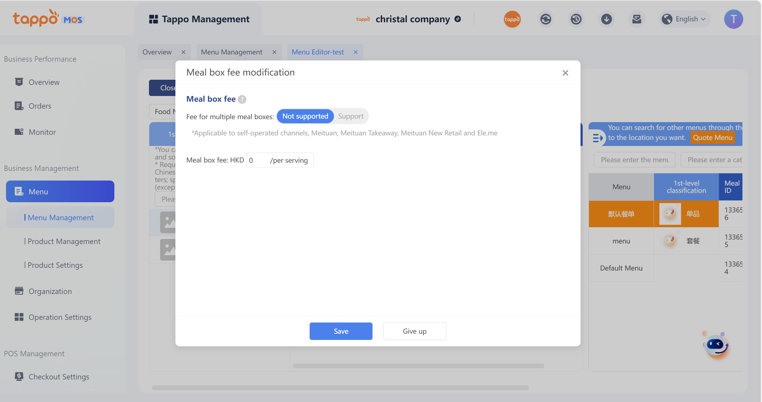 修改餐單渠道/業務類型