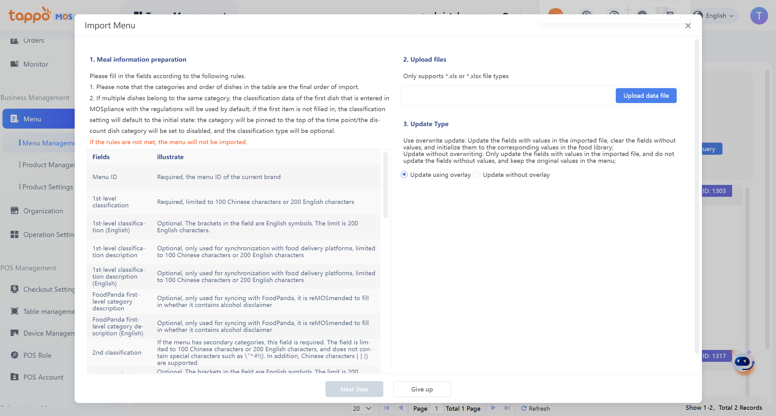 部分餐品欄位跟餐單設置時,可進行導入更新。包括:餐品描述/(英文)、標籤、供應時間、餐品名稱(英文)等。下載導入的範本,按要求填寫餐單的資訊,上傳對應的Excel表格,可實現導入餐單,注意:導入餐單的操作為覆蓋導入,即先清除對應餐單的資訊,再導入新的餐單資訊。