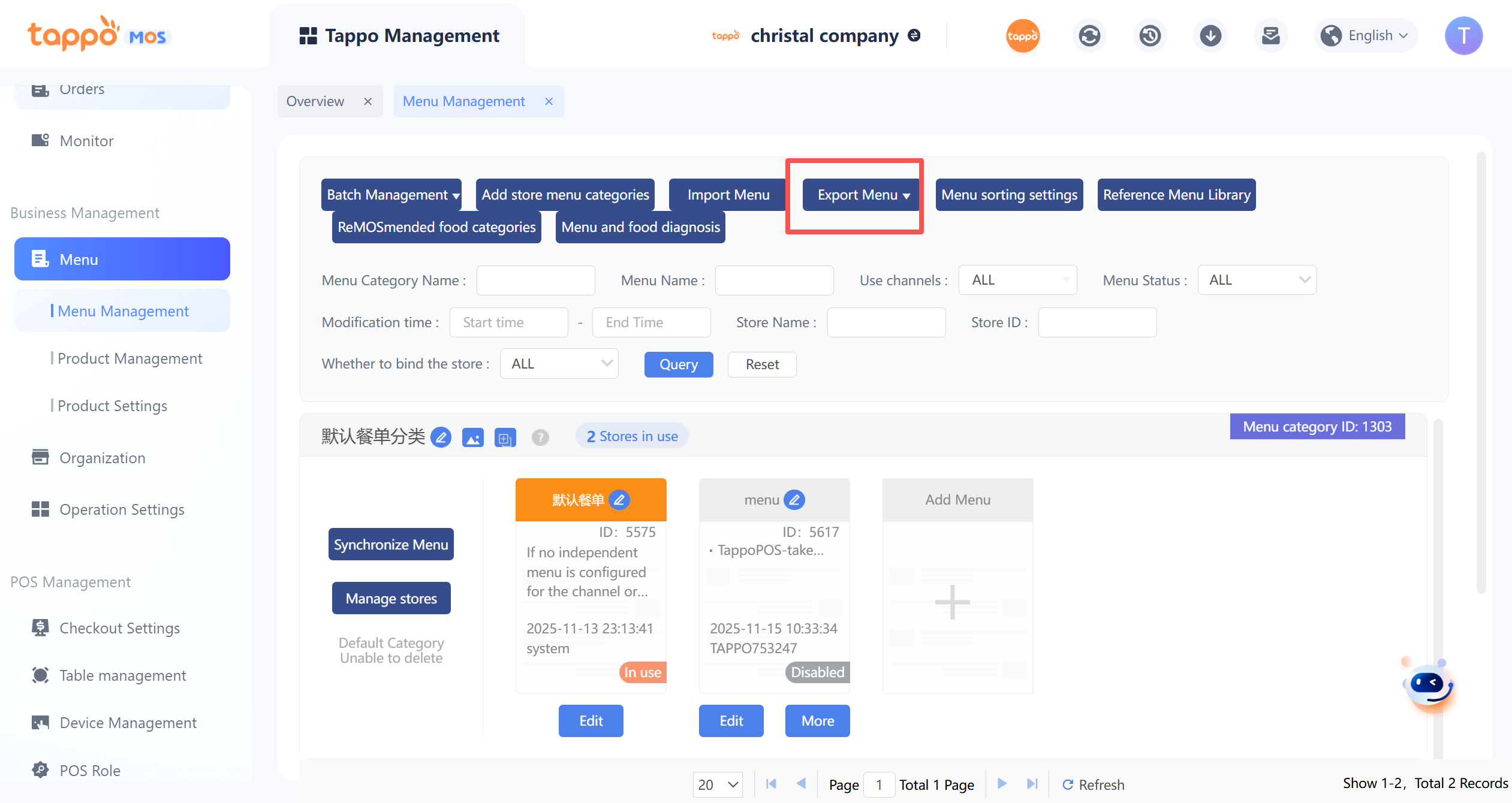 在餐單管理頁面點擊【導出餐單】,選擇需要匯出的餐單。
