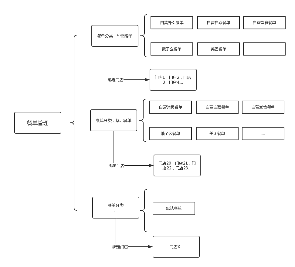 餐單管理中,用“餐單分類”管理不同門店的餐單。同一個“餐單分類”的門店使用相同一套餐單。在一個“餐單分類”中,可包含不同渠道、不同業務類型的餐單,如下圖所示。