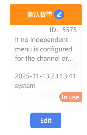 2. 默認餐單:每個餐單分類中,均有一個默認餐單。當渠道或業務類型未配置獨立餐單時,則使用默認餐單,如下圖所示。