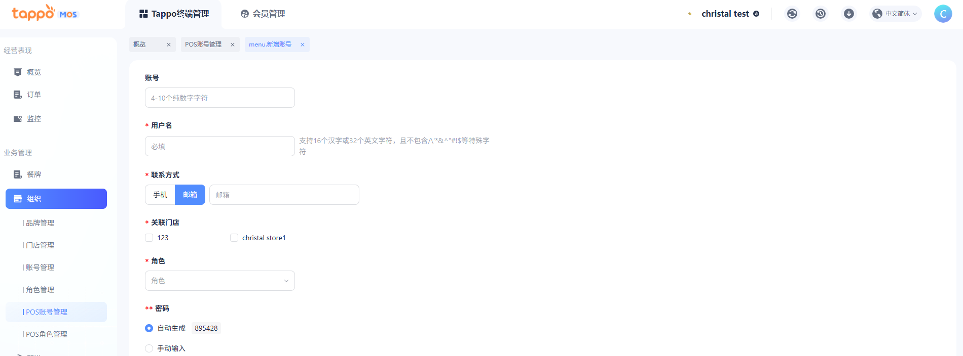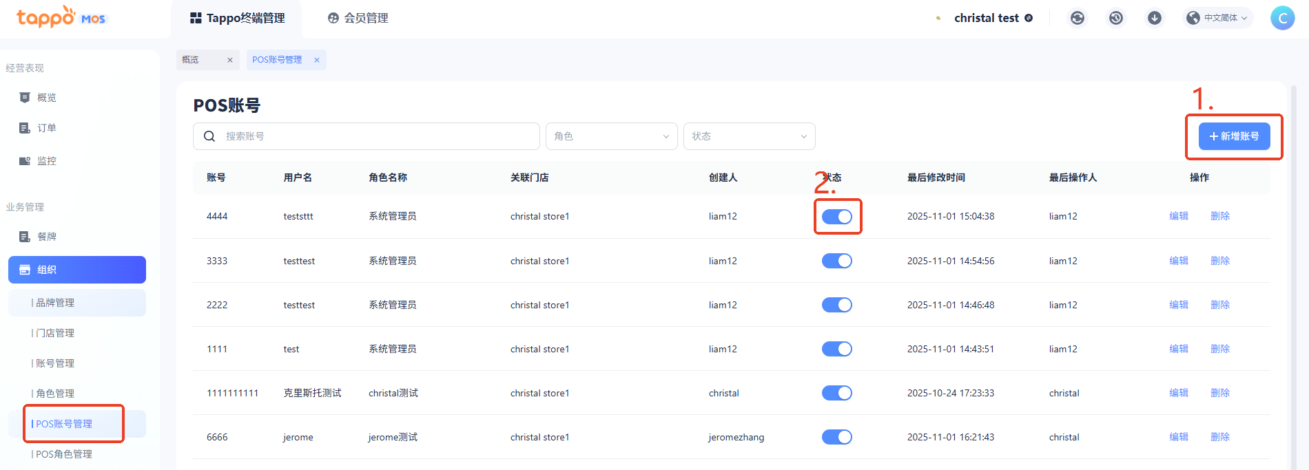 Generic selectors Exact matches only Search in title Search in content Post Type Selectors Home功能指南TAPPO管理POS賬號管理 註冊/登入 登入 忘記密碼 註冊 概覽 訂單 訂單管理 訂單退款 關注訂單 卡券訂單 監控 監控看板 監控異常 監控通知 餐牌 餐牌管理 餐品管理 餐品設置 組織 品牌管理 門店管理 庫存管理 賬號管理 角色管理 經營設定 任務中心 原因設置 稅務管理 三方 連接管理 三方同步 三方活動 推送記錄 客戶端 應用管理 商家端 打印模板 報表 運營明細表 用戶分析表 銷售分析表 財務報表 運營分析圖 維度報表 自定義報表 POS管理 檯號管理 收銀設置 設備管理 POS賬號管理 POS角色管理 訂閱管理 訂閱管理 切換品牌 個人中心 Hamburger Toggle Menu POS賬號管理 路徑:Tappo終端管理->組織->POS賬號管理 1. 新增賬號:POS賬號用於登錄Tappo POS收銀端。點擊【新增賬號】,跳轉至新增賬號頁面,新增POS賬號需要填寫賬號、用戶名、聯系郵箱、關聯門店、角色等信息,完成填寫後保存即生成新的賬號。 2. 狀態:點擊可切換賬號狀態,若賬號停用,則無法登錄Tappo POS。 Help us give you a better customer experience. Send